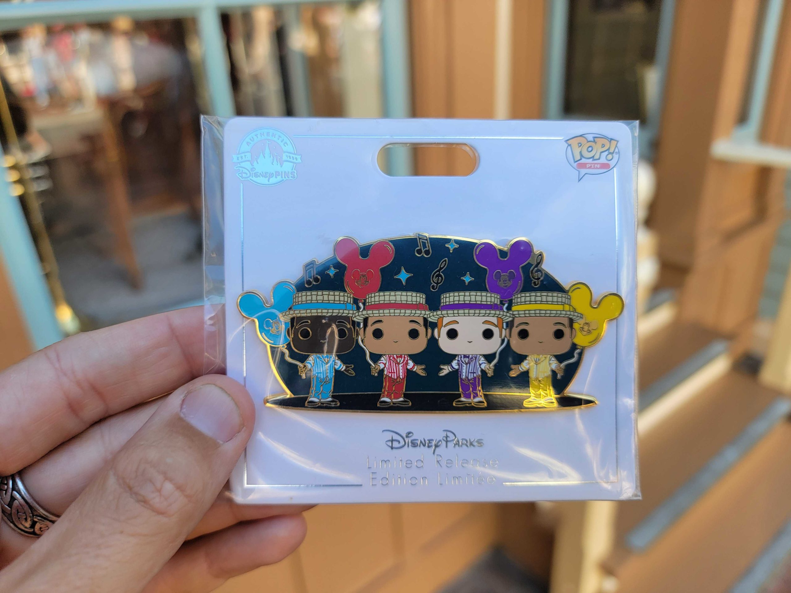 Next up is this Funko POP!-inspired pin. It features the four Dapper Dans in a Funko style, each holding a Mickey balloon in their signature color. The background is dark blue, with stars and music notes floating around them.