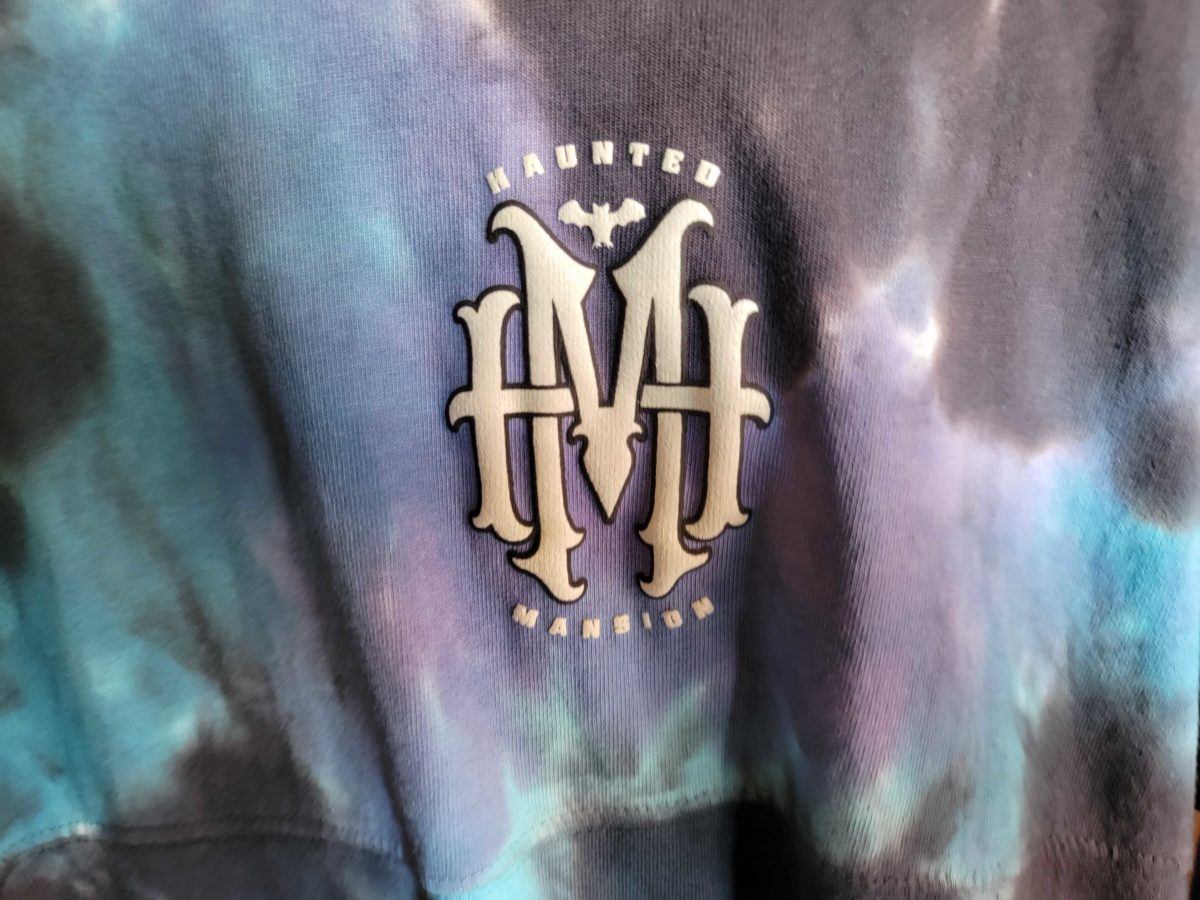 A white logo for the Haunted Mansion is on the left breast. It features “H” and “M” in gothic font, overlapping below a bat silhouette. “Haunted Mansion” is in block lettering around the logo.