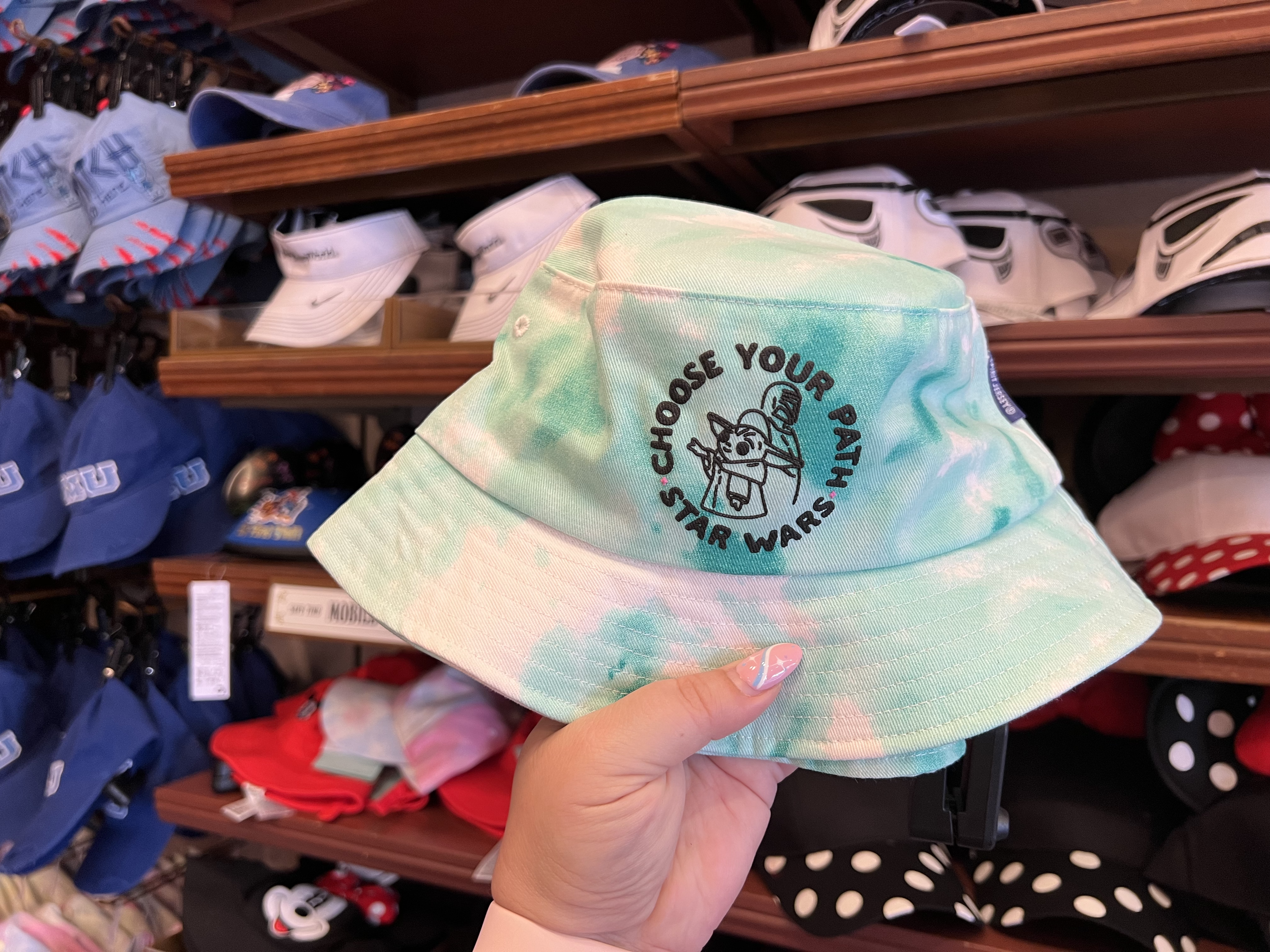 A Grogu and Mandalorian bucket hat is available at the Emporium. It is a mint tie dye design with Spirit Jersey material.