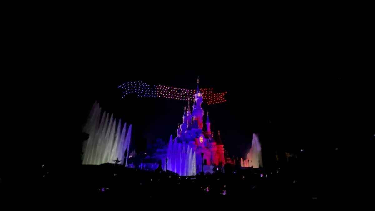 The drones usually appear in the “Disney D-Light” preshow for “Disney Illuminations” to create the Disneyland Paris 30th Anniversary logo. In this performance, we saw them take the shape and colors of the French flag to celebrate the country’s national holiday.