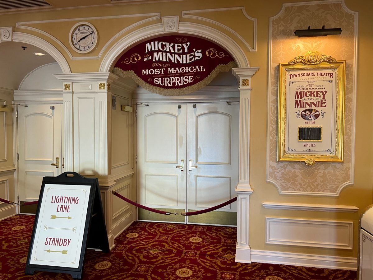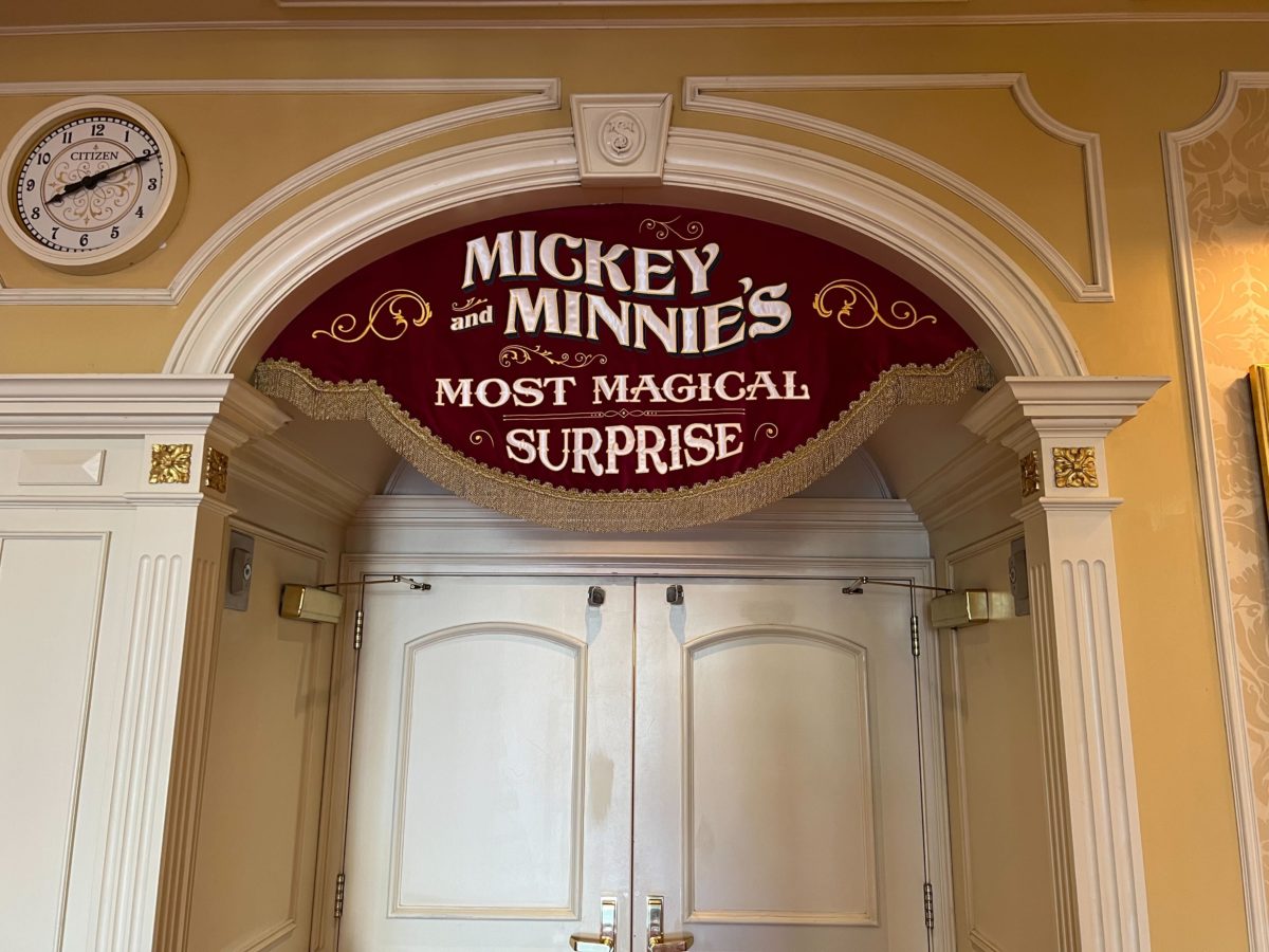 The banner above the indoor entrance reads “Mickey and Minnie’s Most Magical Surprise.”