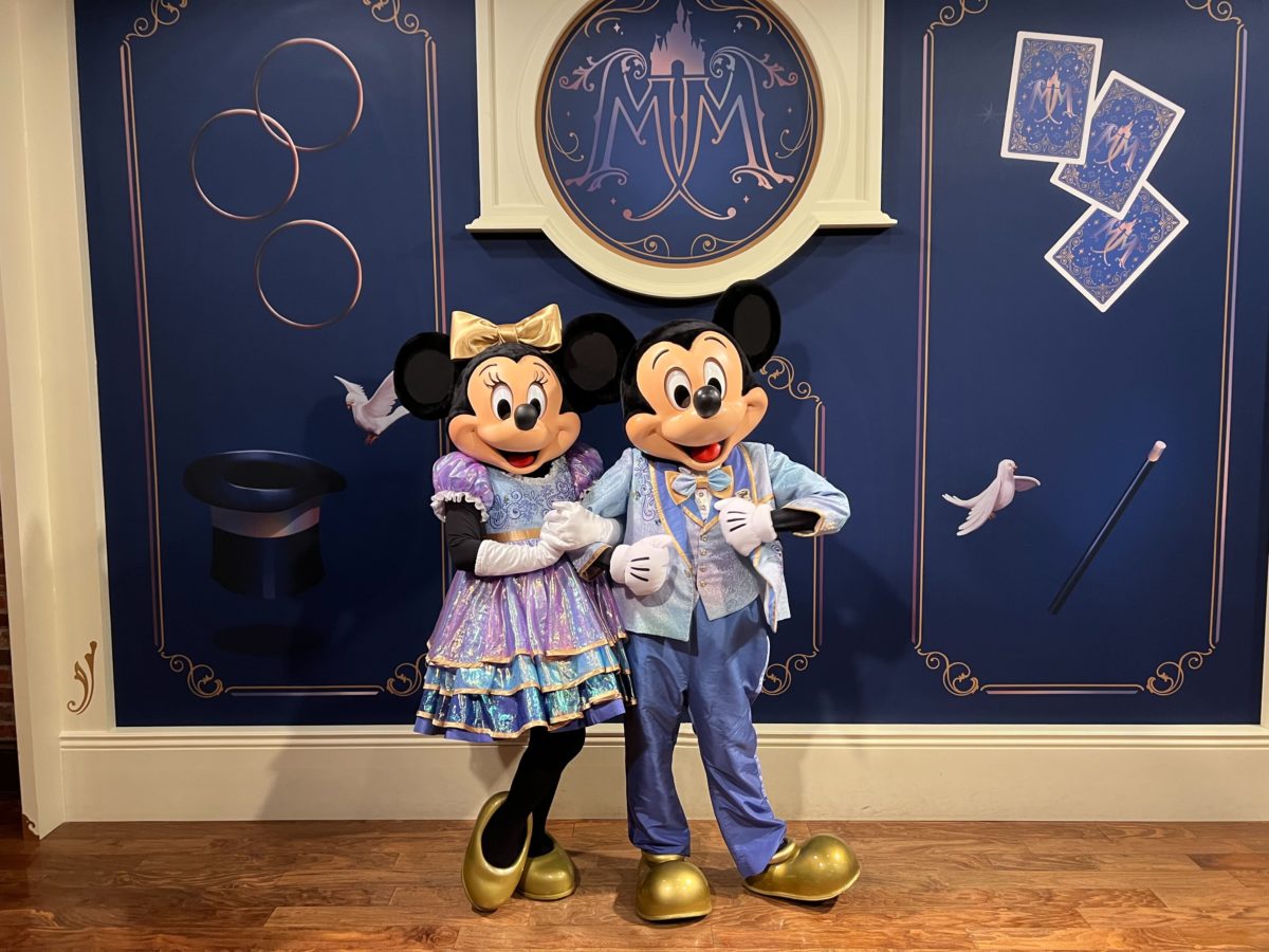 She and Mickey are pictured on the banners as “The Master Magicians” in their 50th anniversary outfits.