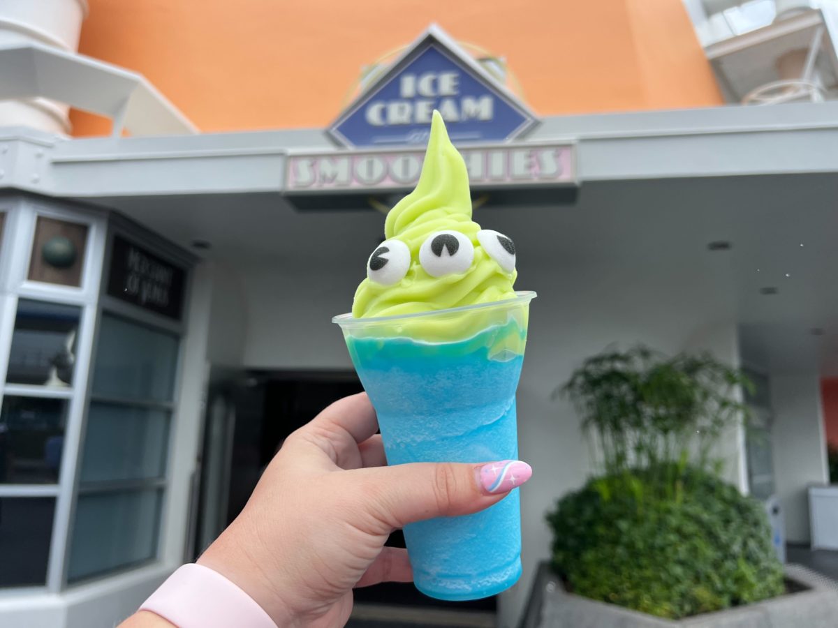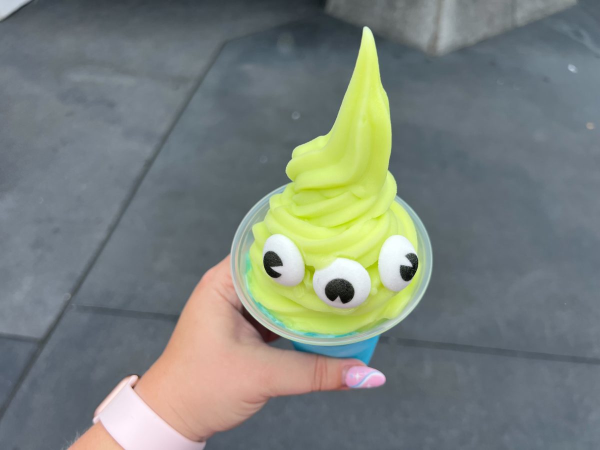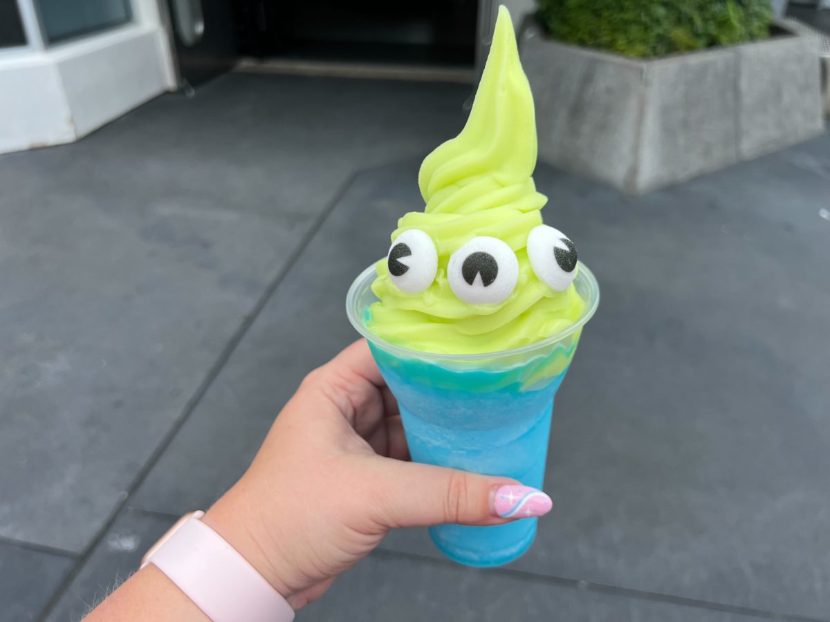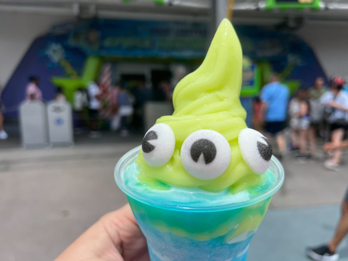 This treat is inspired by the green aliens from “Toy Story,” with three sugared eyes sitting in green DOLE Whip atop the blue slush.