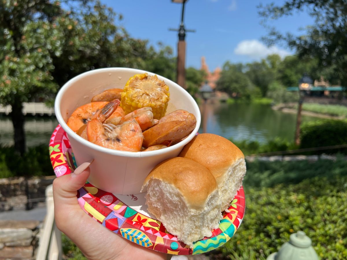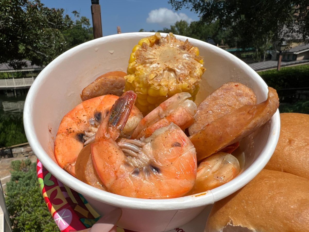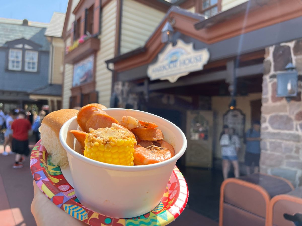 It’s a beautiful weekend at the Magic Kingdom, and we decided to make a quick lunch stop to try the New England Shrimp Boil from Columbia Harbor House.