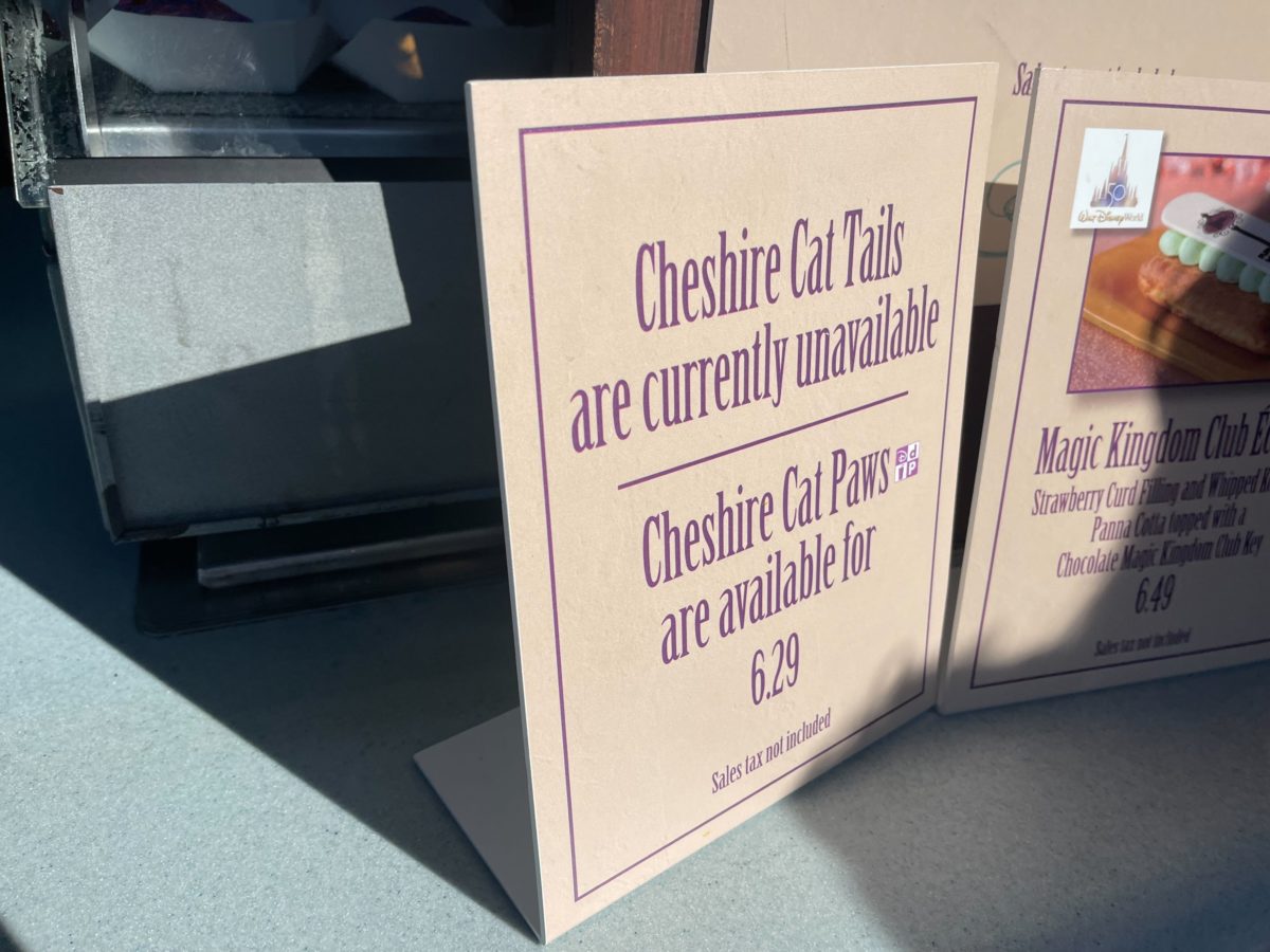 The Cheshire Café in Magic Kingdom is serving up a new pastry inspired by the titular Cheshire Cat. While the Cheshire Cat Tail was actually available today, signs indicated it was being offered as a replacement.
