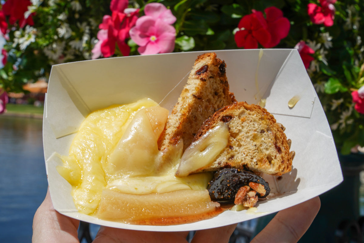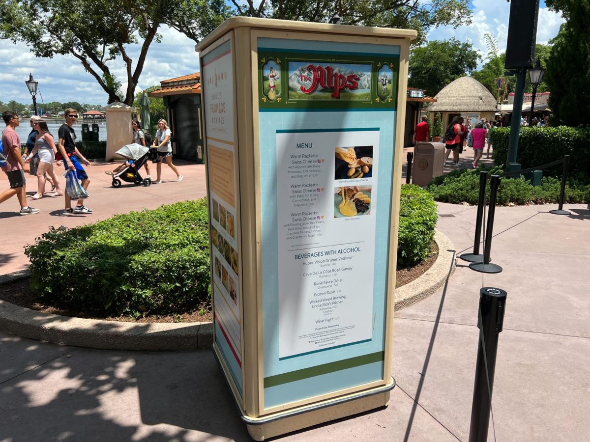 The Alps span eight European countries, so the food booth, available during the EPCOT 2022 International Food & Wine Festival, has done a great job bringing all of those European flavors together and representing all the different cultures and cuisines. Looking for savory options? Try the swiss cheese raclette with ham and a hearty beer. Or, for those looking for something sweet, there’s a pear and pecan raclette and a frozen rosé!