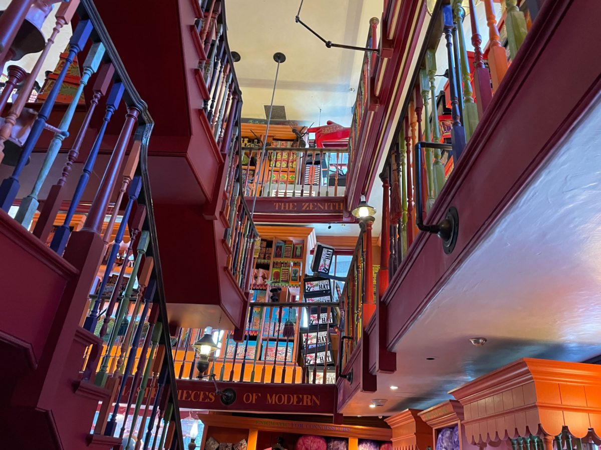 It usually rides a unicycle back and forth along a tightrope between two railings in the ceiling of the store. The toy is available for purchase and the display version helps guests understand what it does, plus adds a fun kinetic element to the chaotic shop.
