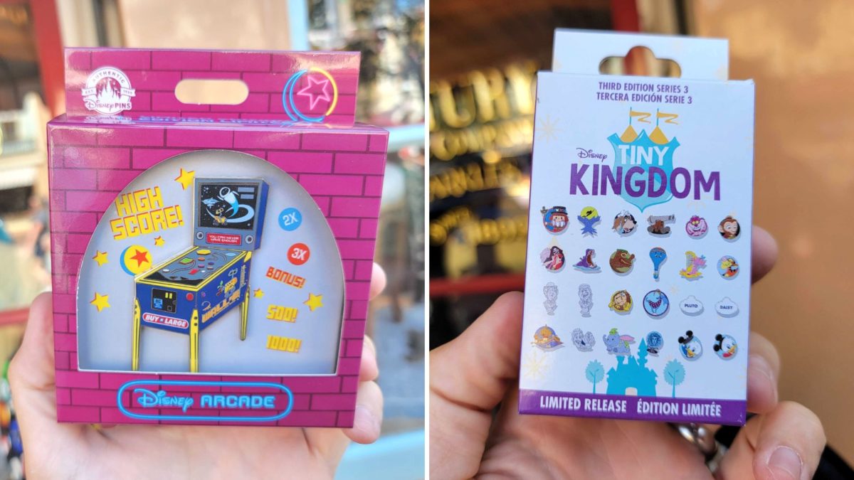 A new limited edition WALL-E Disney Arcade pin and Tiny Kingdom mystery pin set are available at 20th Century Music Co. in Disneyland this week.