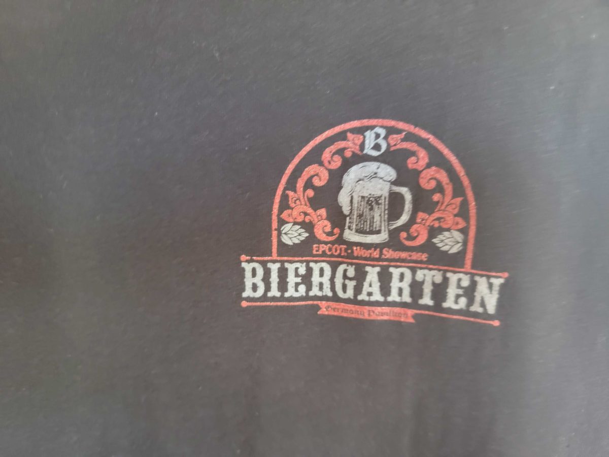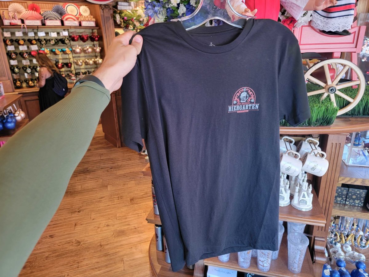This black t-shirt features a Biergarten crest, centered appropriately around a mug full of beer.