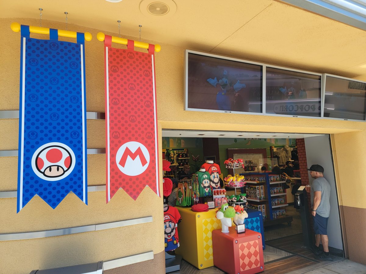 There are two front doors and two side doors to the shop. The door to the right features banners of Luigi and Princess Peach.