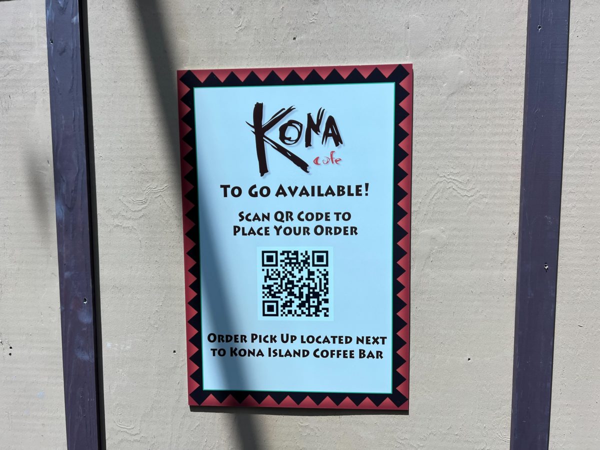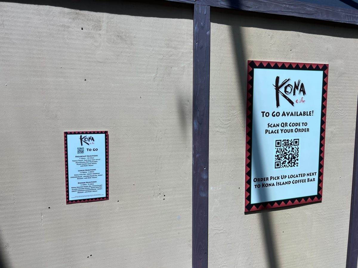 The signs for the to-go menu feature a QR code that directs guests to the My Disney Experience app, where they can use Mobile Order. Currently, a limited menu is being offered.
