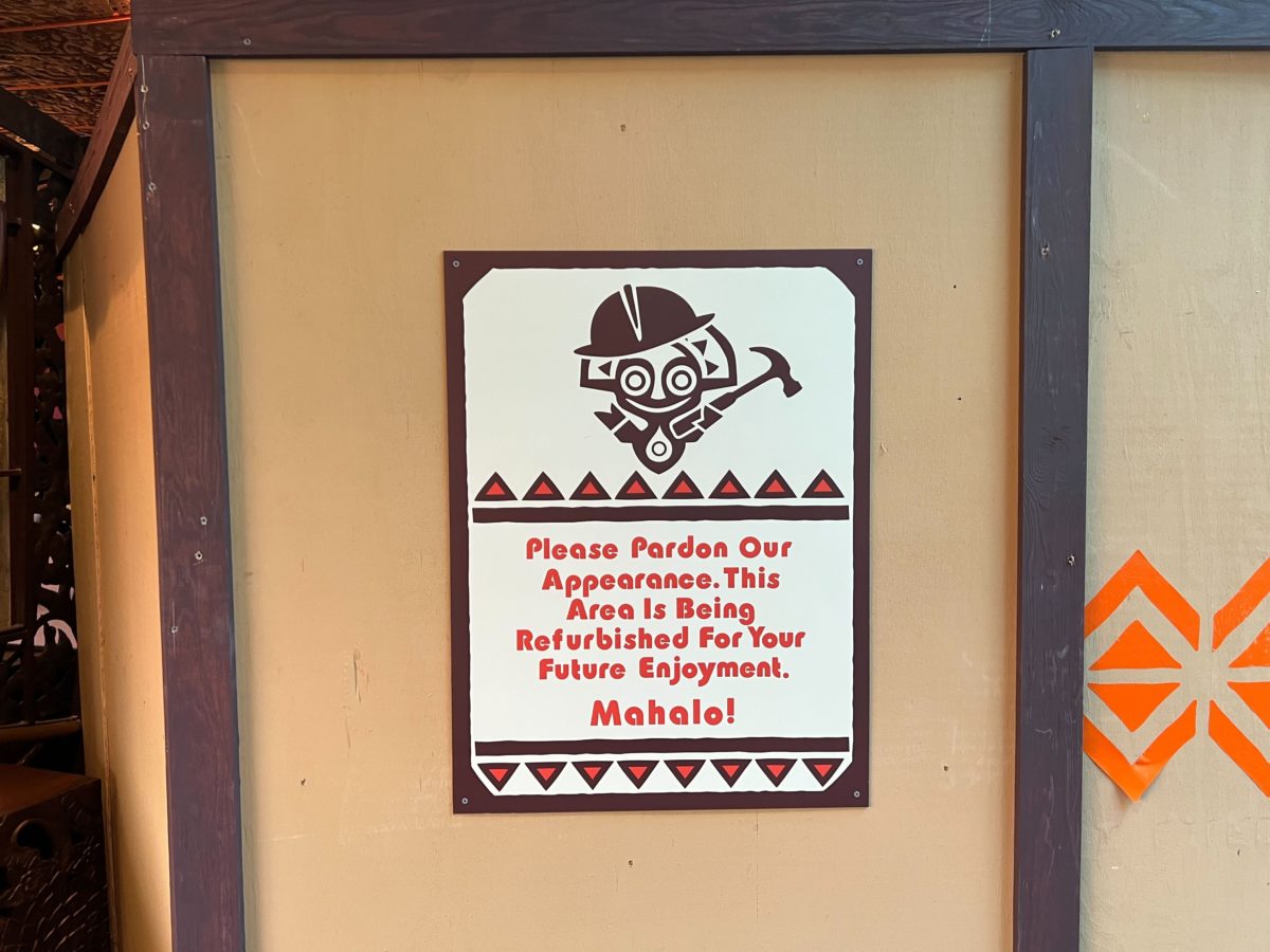 The tiki god Maui, wielding a hard hat and hammer, appears on signage notifying guests of the work being done.