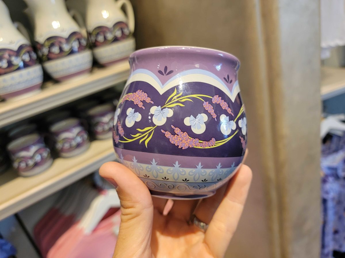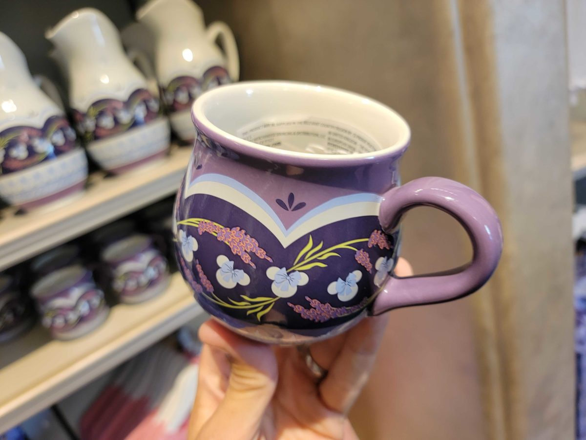 This mug is multiple shades of purple, with Minnie heads wearing light blue bows all around the side. There are also images of lavender on greens tems.