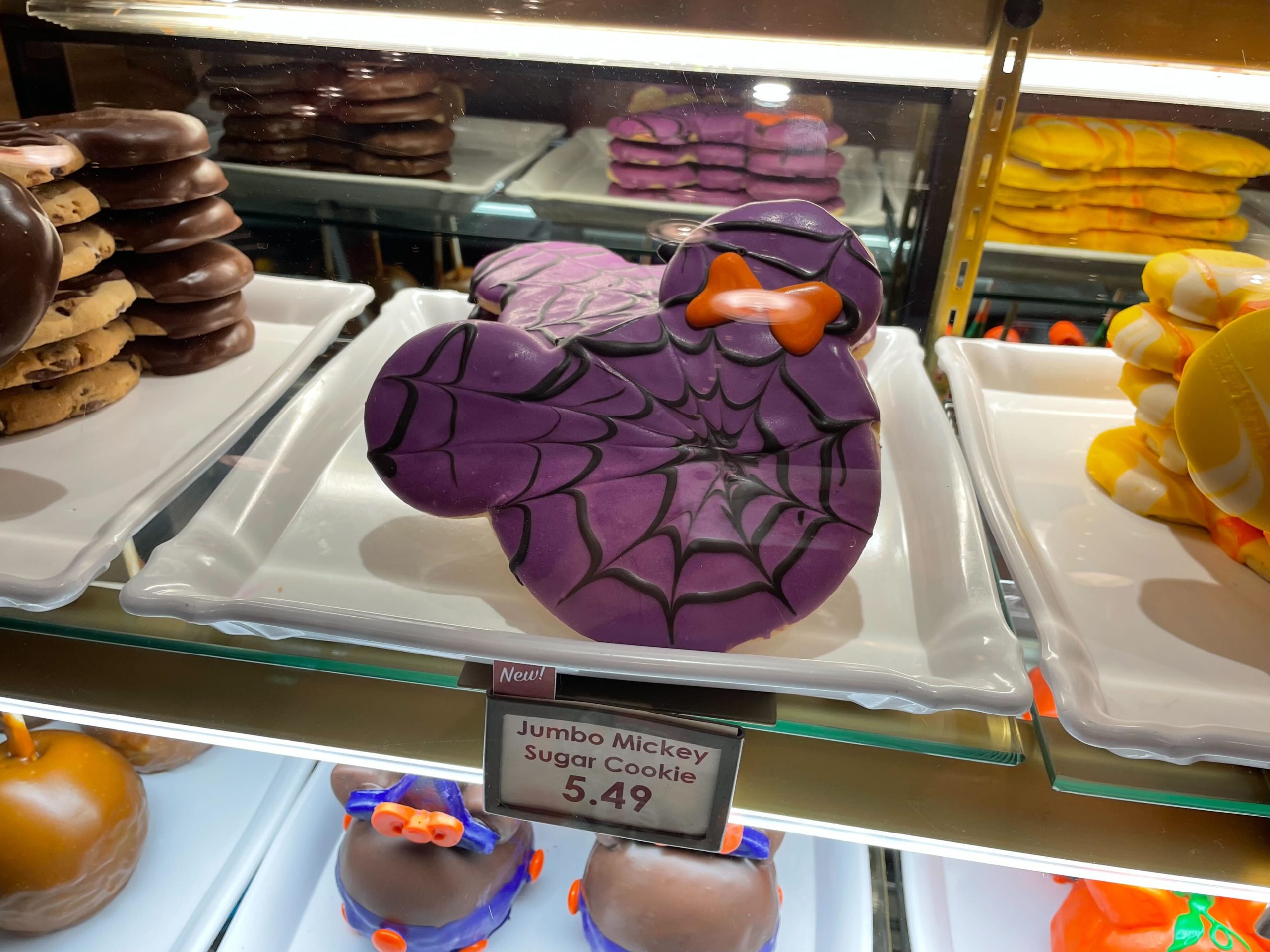 The jumbo Mickey sugar cookie looks more like a Minnie cookie with its orange bow. It has the standard sugar cookie flavor with purple icing and a black spiderweb design.