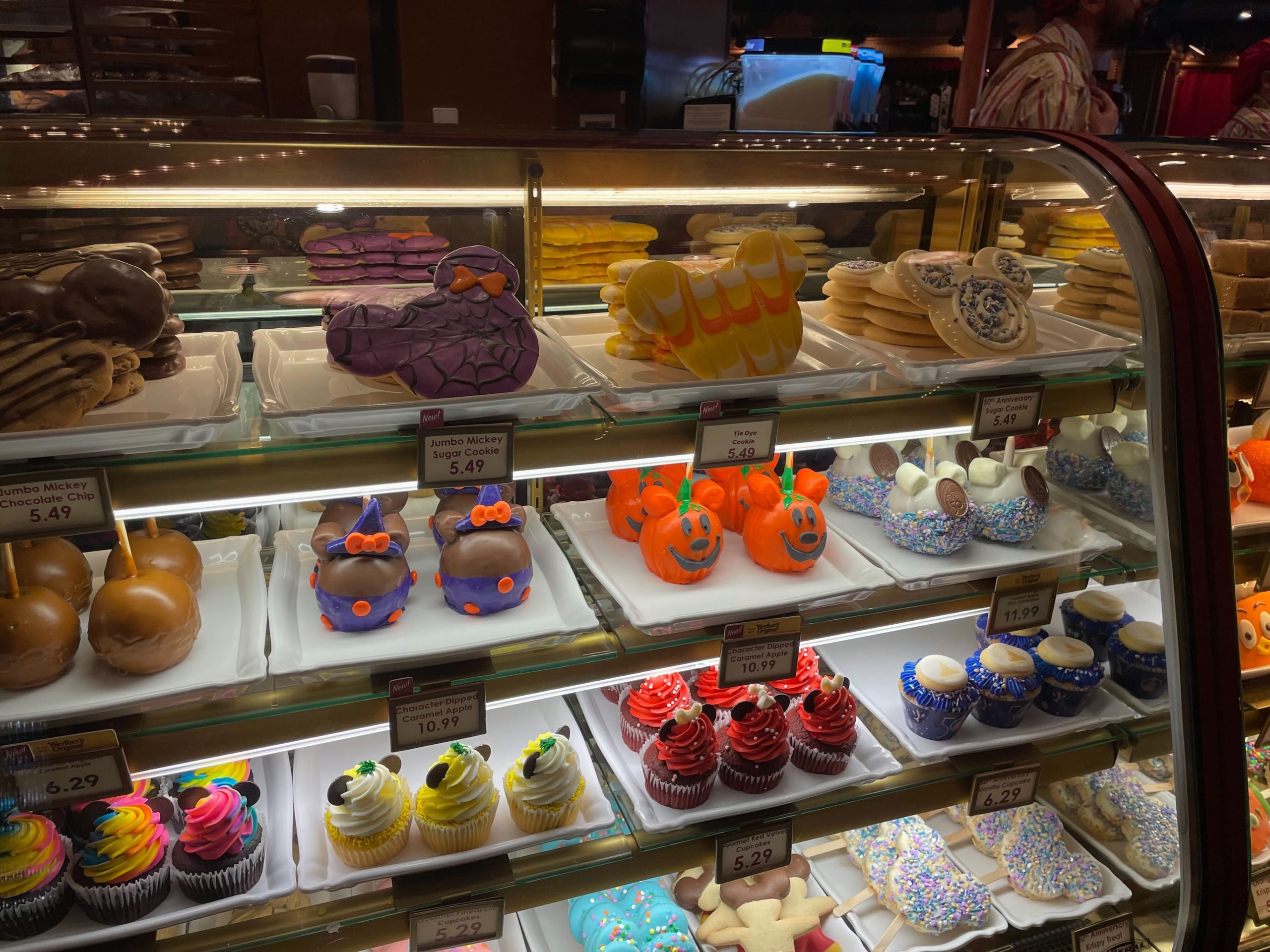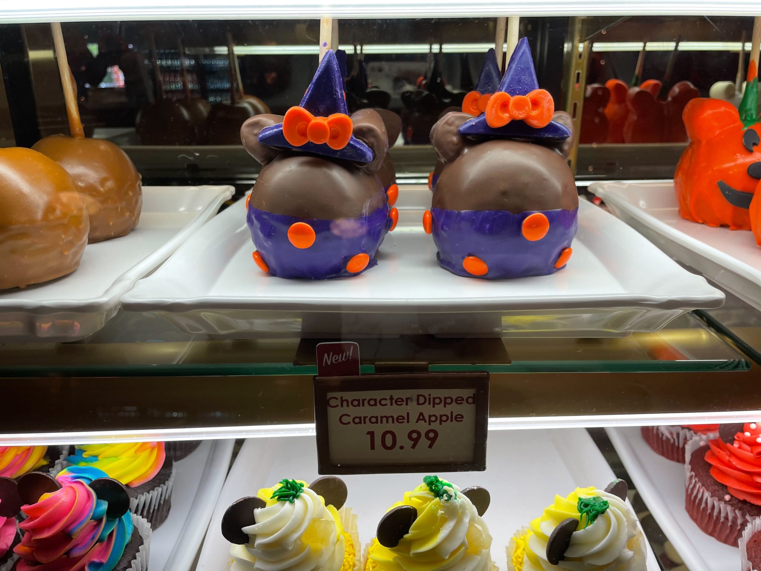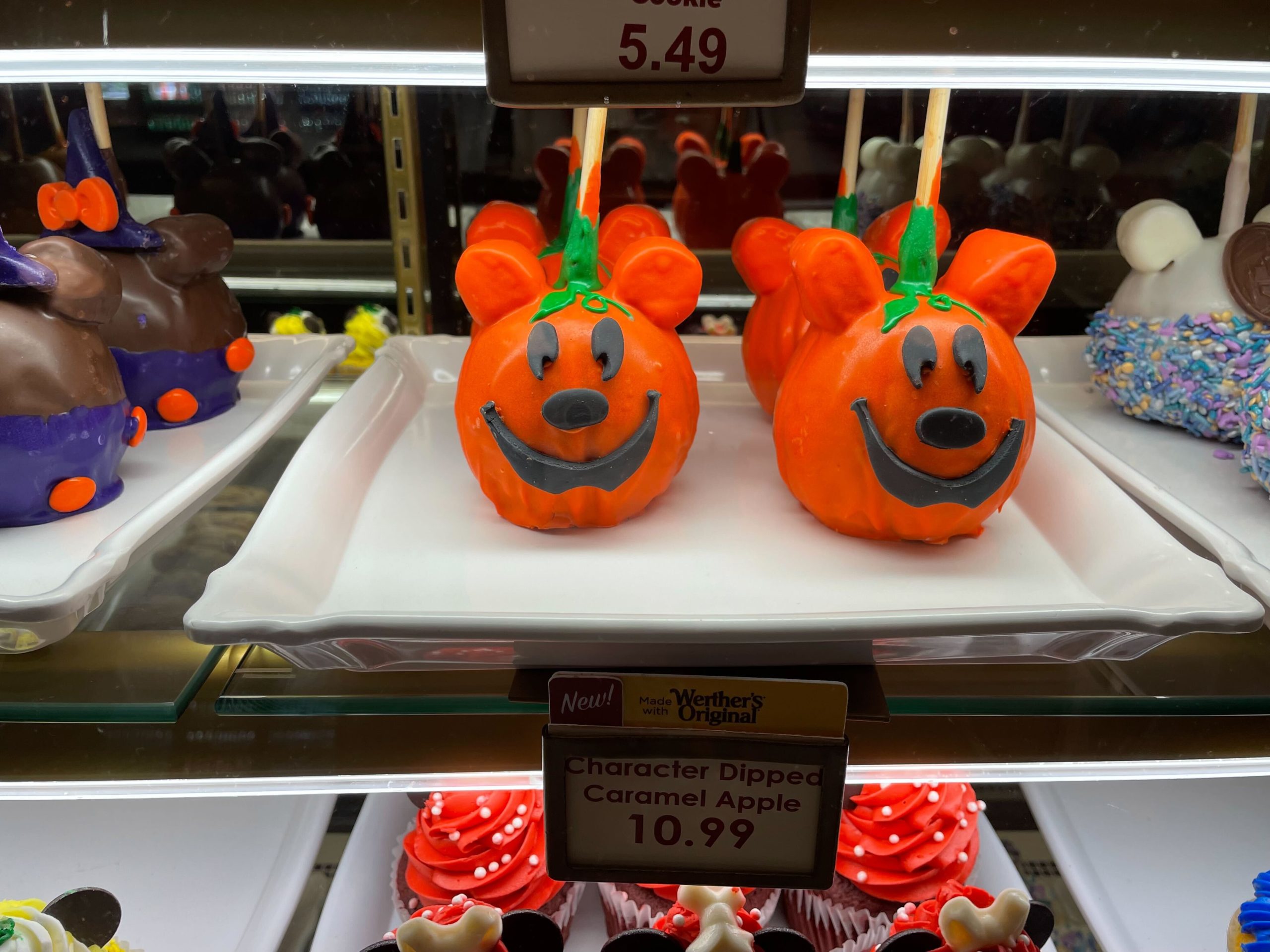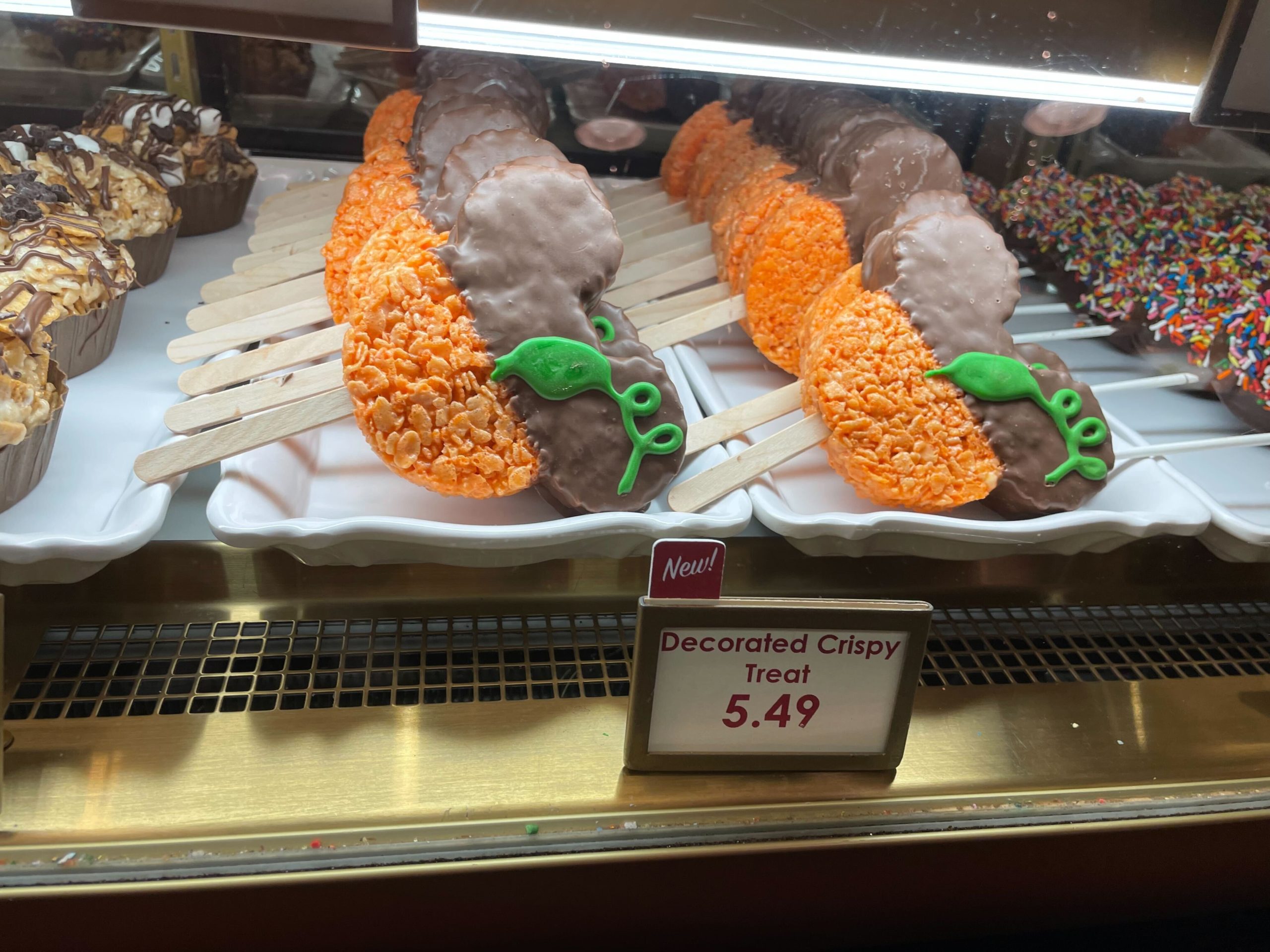Halloween treats have arrived to celebrate the season at Magic Kingdom. In Big Top Souvenirs at the bakery counter, we found a Mickey jack-o’-lantern caramel apple, a pumpkin flavored rice crispy, and more.