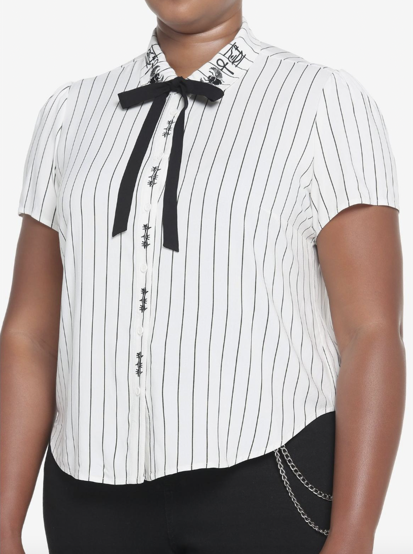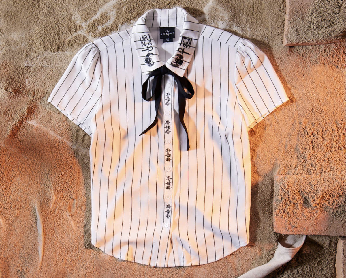This blouse resembles the one worn by Evelyn in “The Mummy.” It’s white with black pinstripes and a black necktie. Hieroglyphics are between the buttons and on the collar.