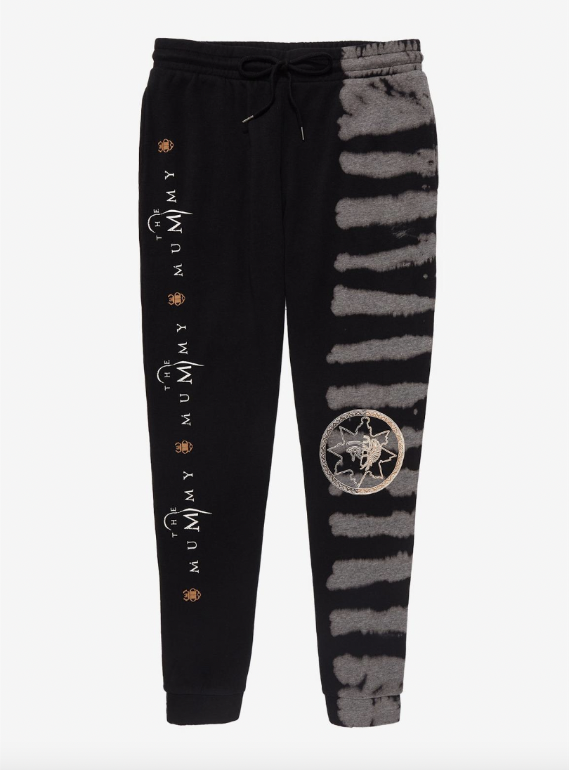 One leg of the sweatpants is solid black, while the other has foggy grey stripes. “The Mummy” is printed on the black leg between golden scarabs. The shape of the key box is on the other leg.