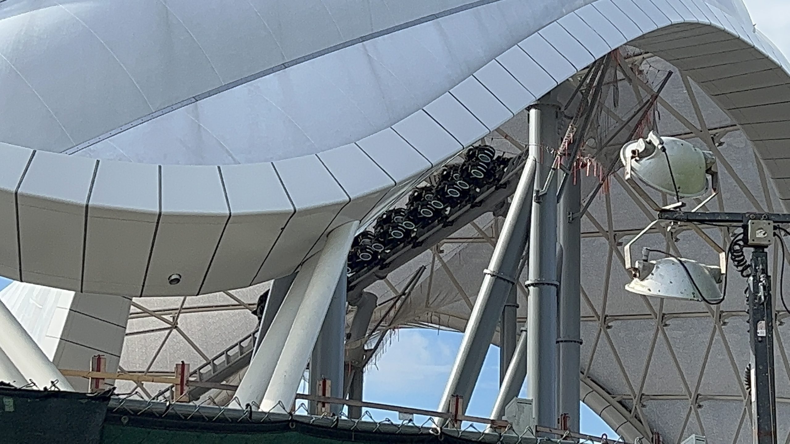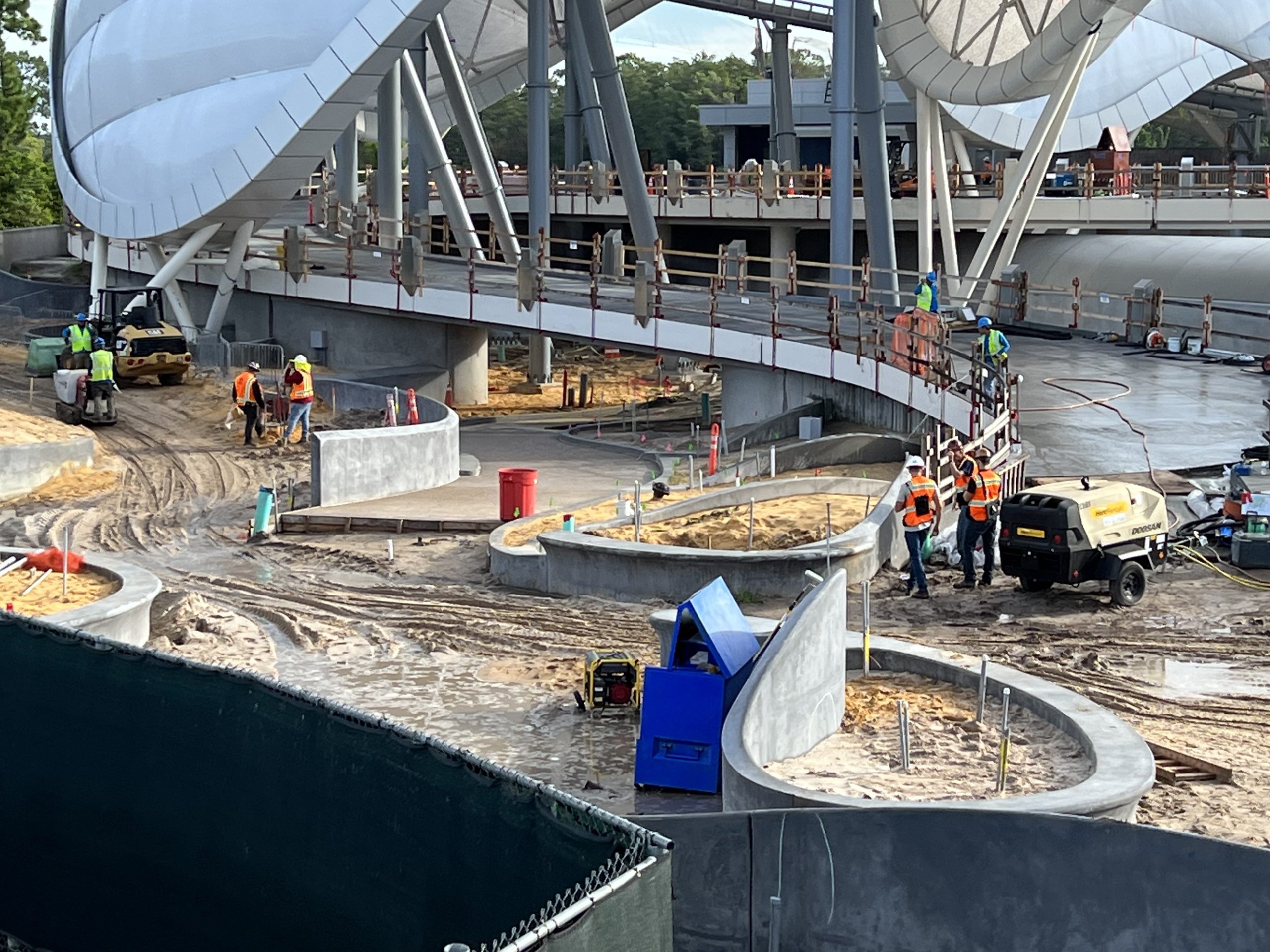 Work is still chugging along at TRON. You can see workers present near the attraction’s future entrance and down below as lampposts are installed along the pathway. Recently, new landscaping has also been installed along the Walt Disney World Railroad’s new path through Tomorrowland.
