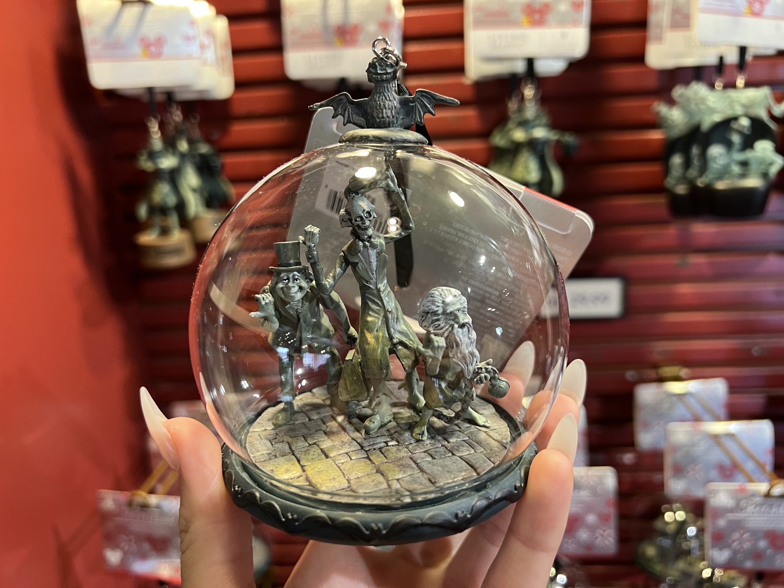 In another section of the store, the Hitchhiking Ghosts are waiting for a ride in this glass sphere ornament near the light-up Constance Hatchaway and Hatbox Ghost ornaments.