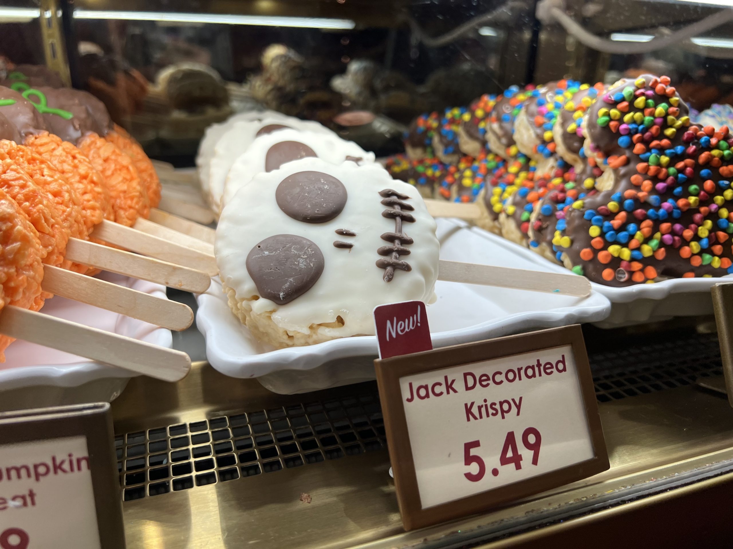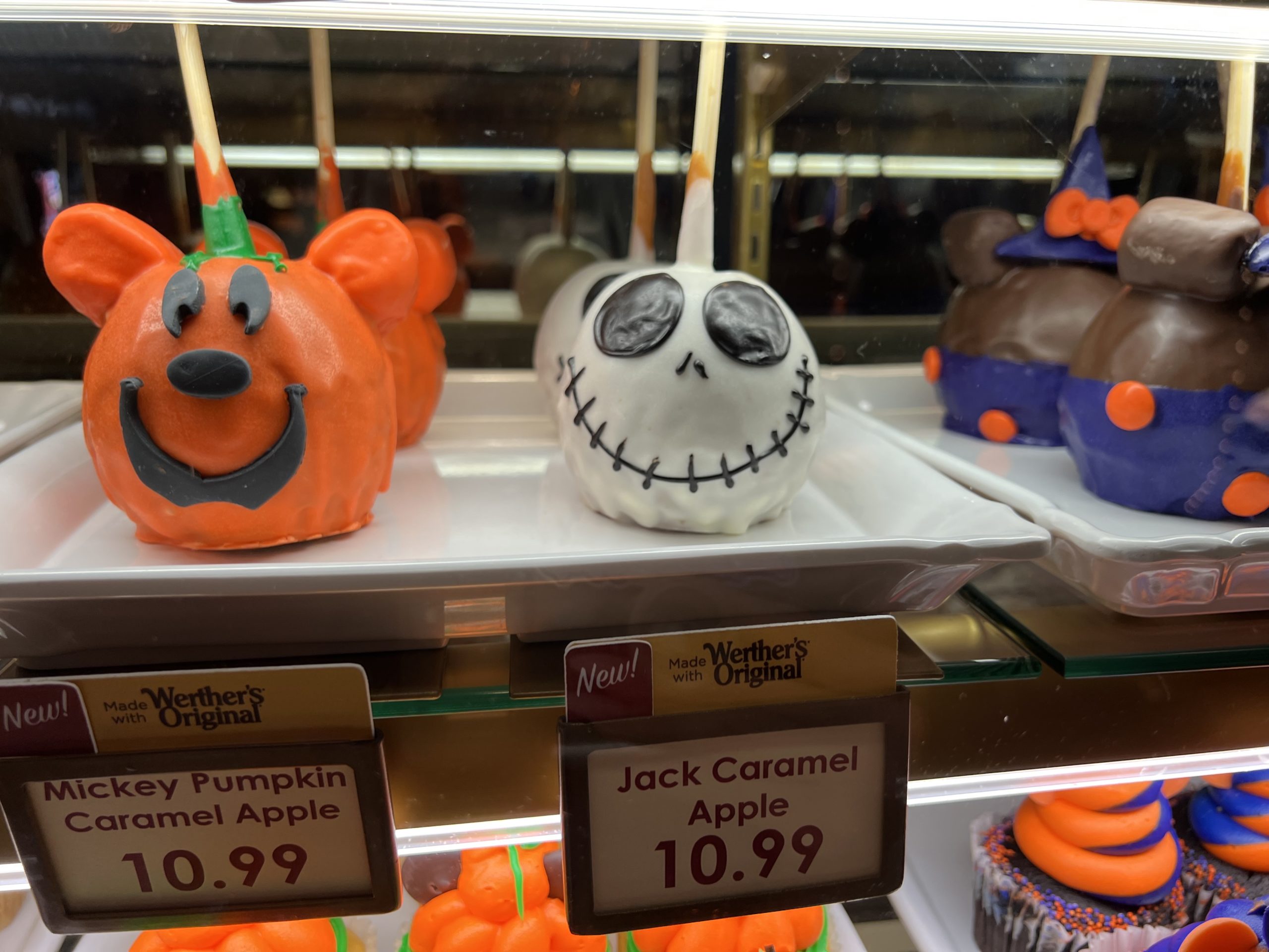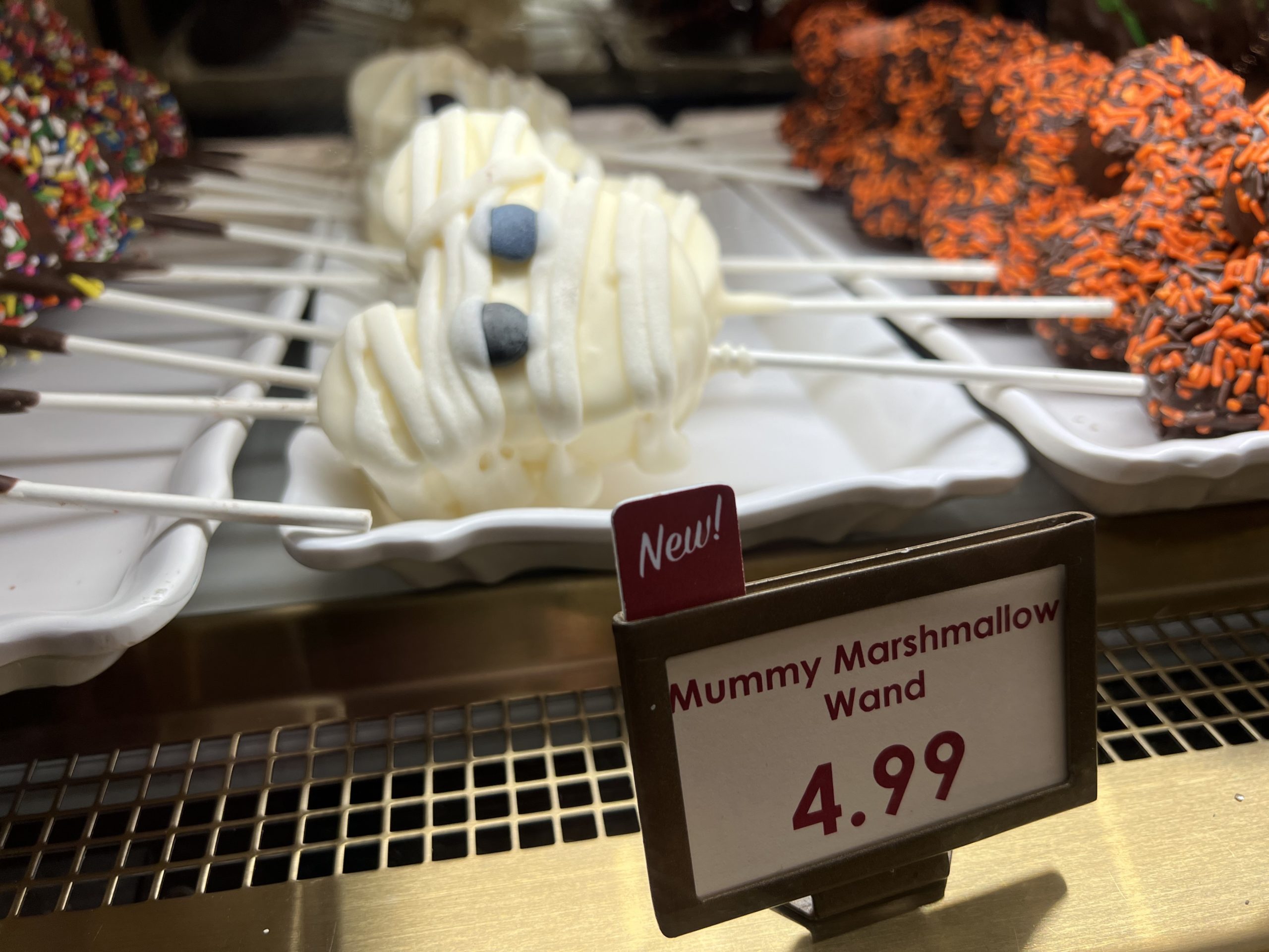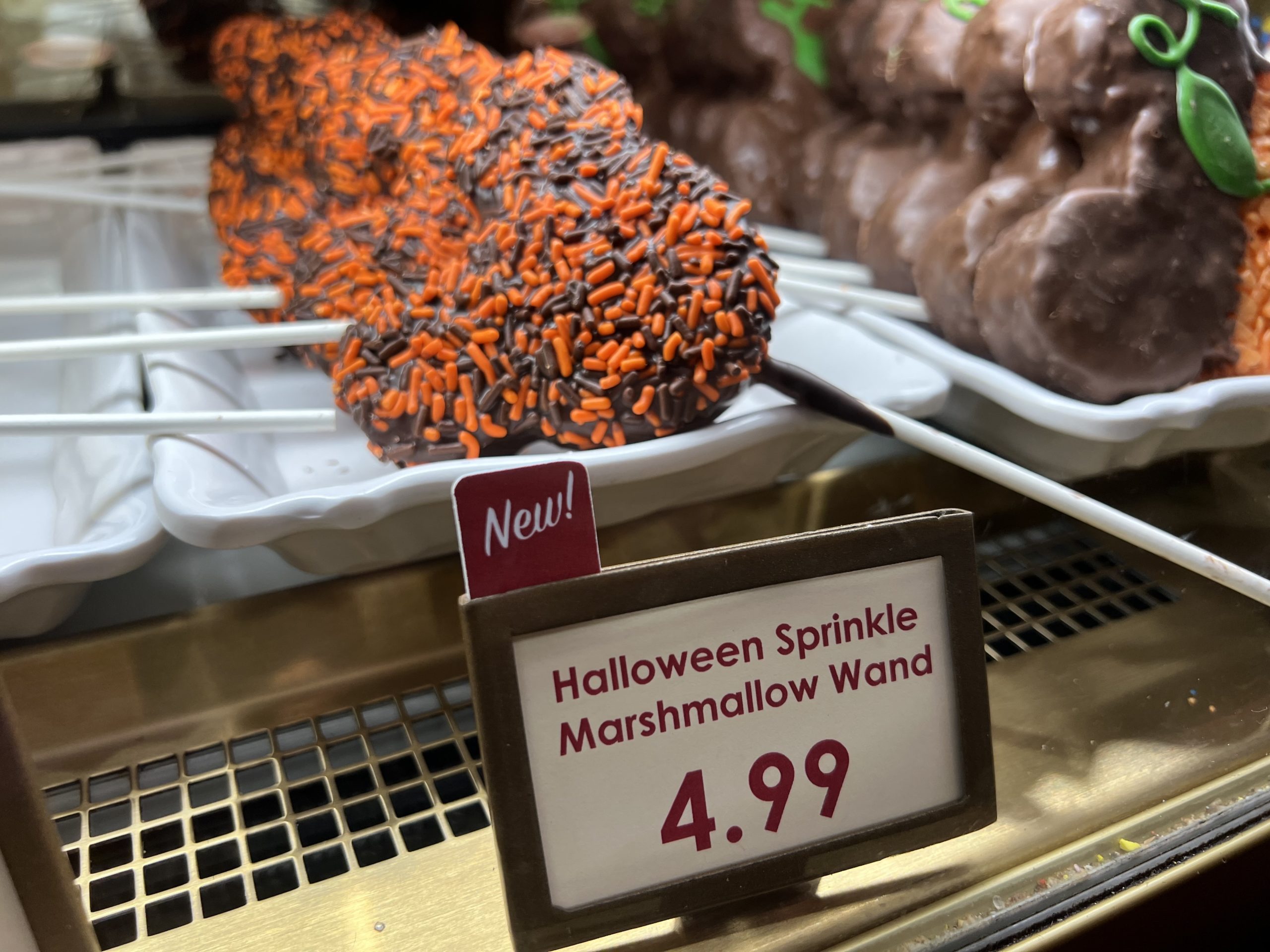 After a quick check-in at Frontierland, we popped in at Big Top Souvenirs where a few new Jack Skellington and Halloween treats are available including a Jack caramel apple, krispy; Mummy Mickey marshmallow wand, and halloween sprinkle marshmallow wand.