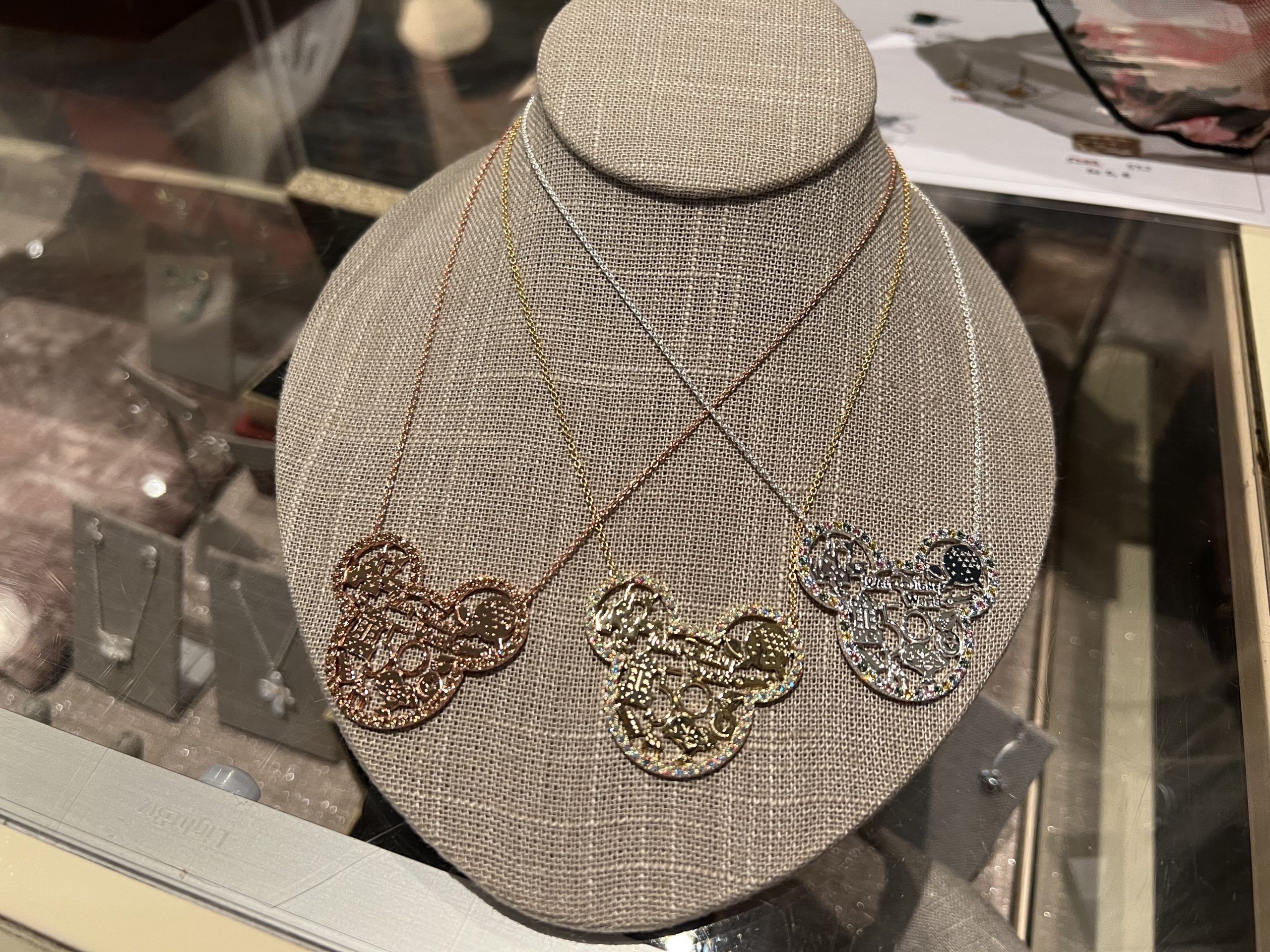 Uptown Jewelers has a few new sparkling Rebecca Hook necklaces. These are rose gold, gold, and silver 50th anniversary necklaces that feature some well-known park icons.