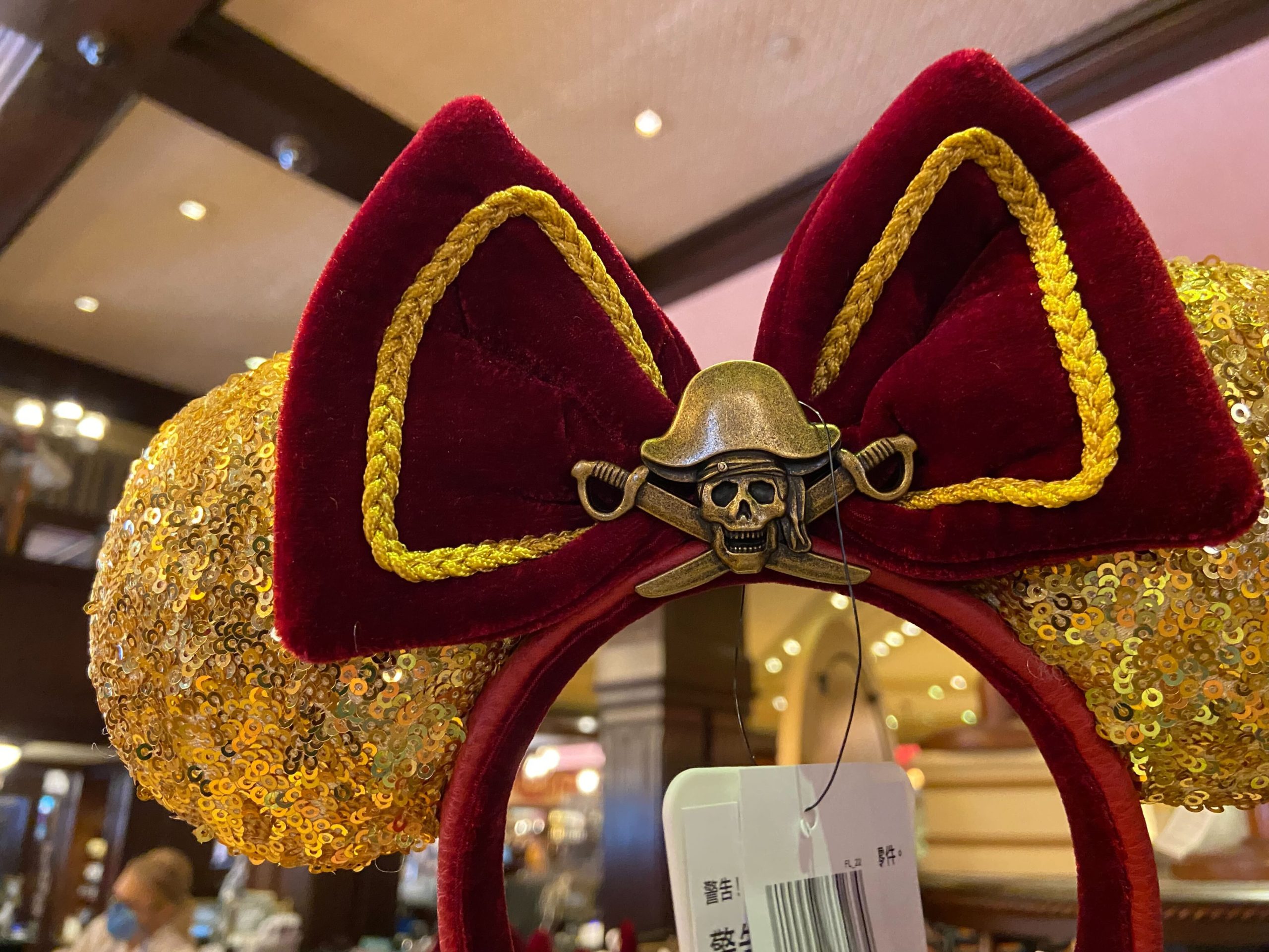 There is a pirate emblem in the center of the ears in a brassy-gold color. A braided gold detail is outlined on the inside of the bow.