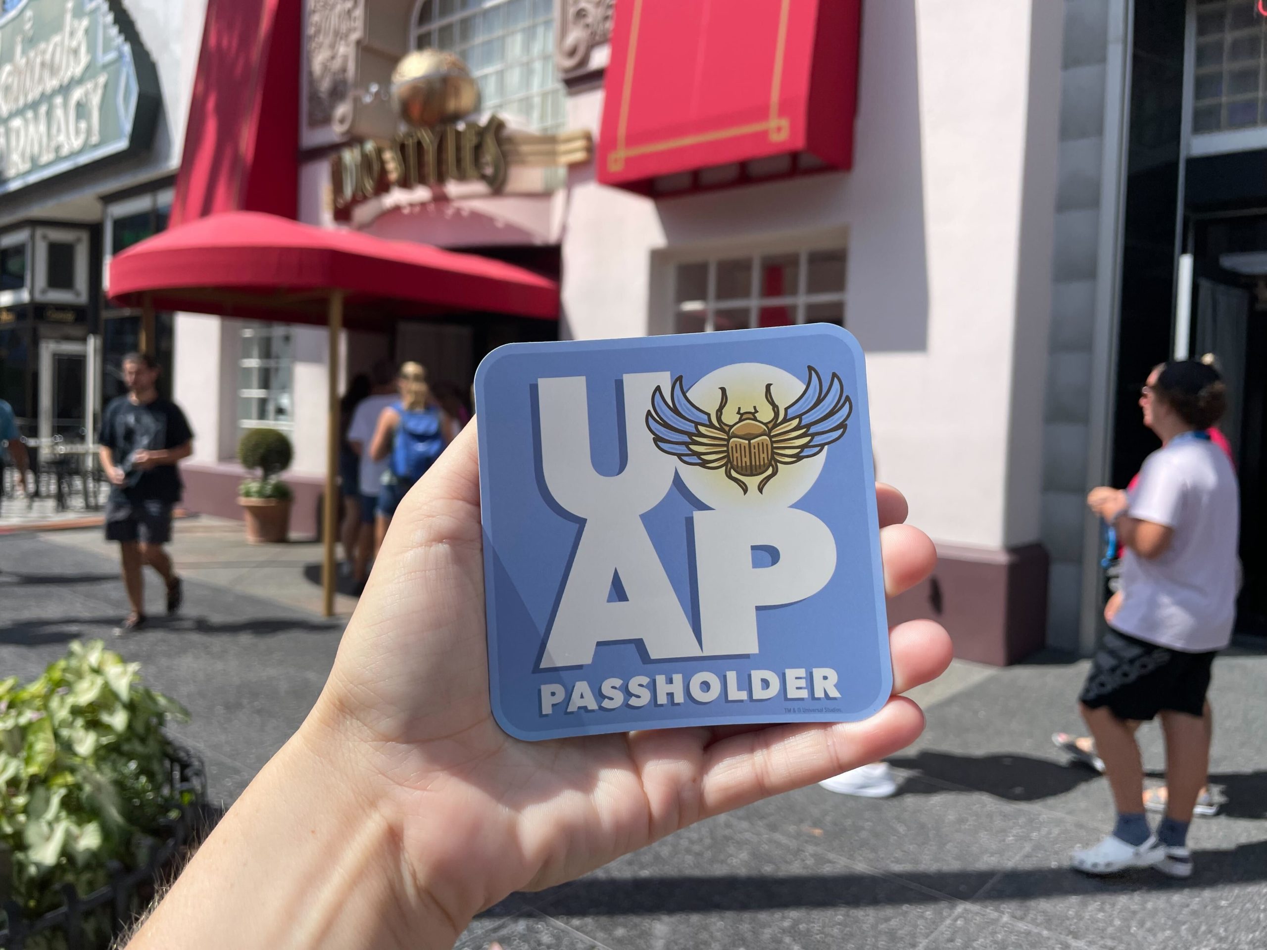 The new UOAP Passholder magnet features a white text on blue background design, with a scarab icon taking over the “O” symbol this time. The background seems somewhat plain compared to previous designs.