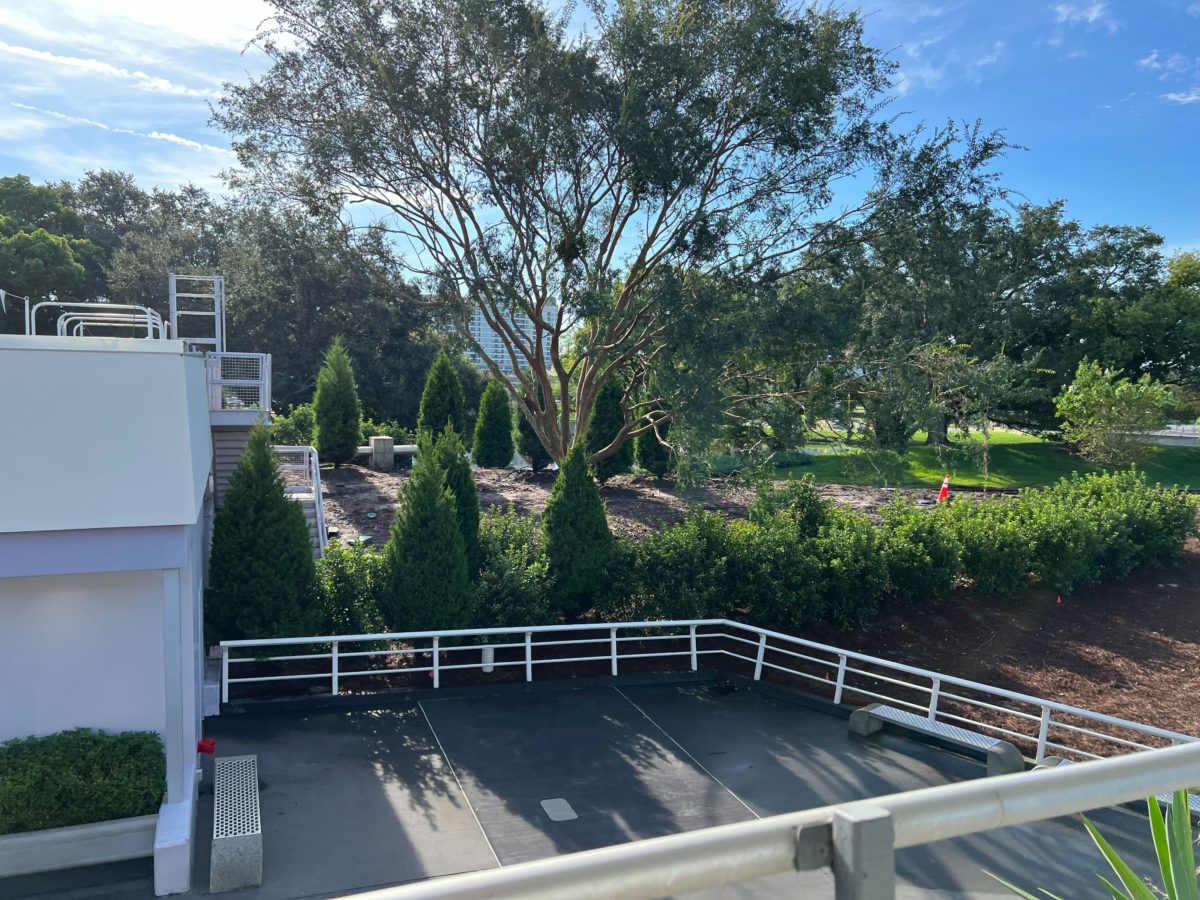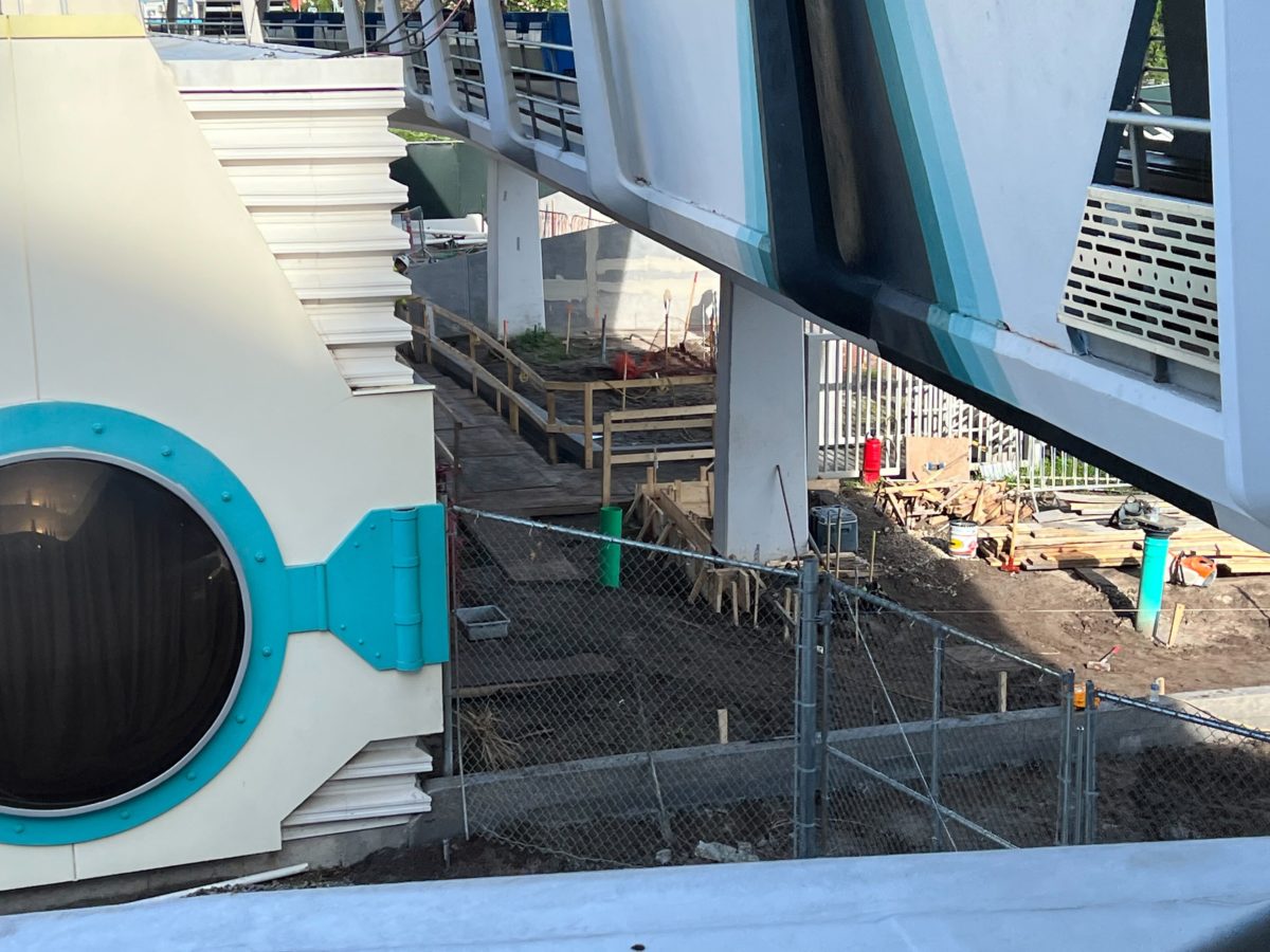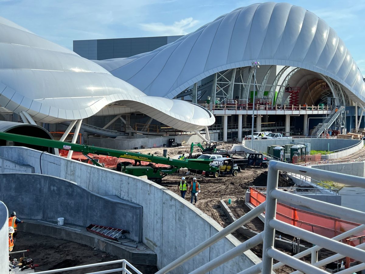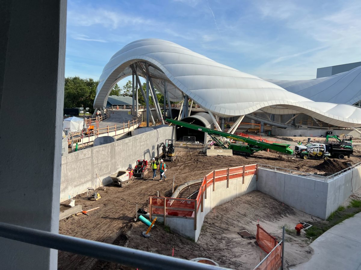 The planters outside of the attraction are filled with dirt and the construction equipment has shifted off to the sides.