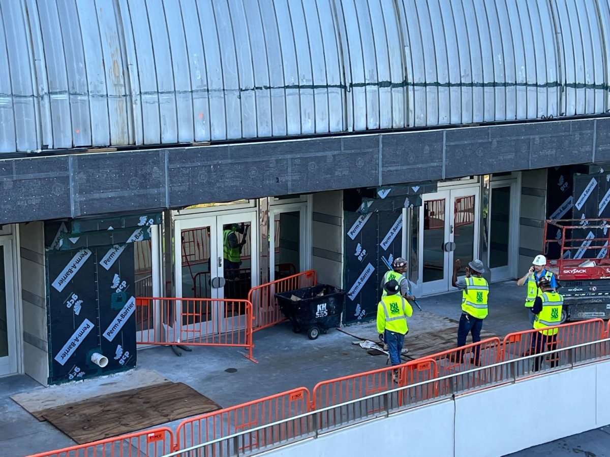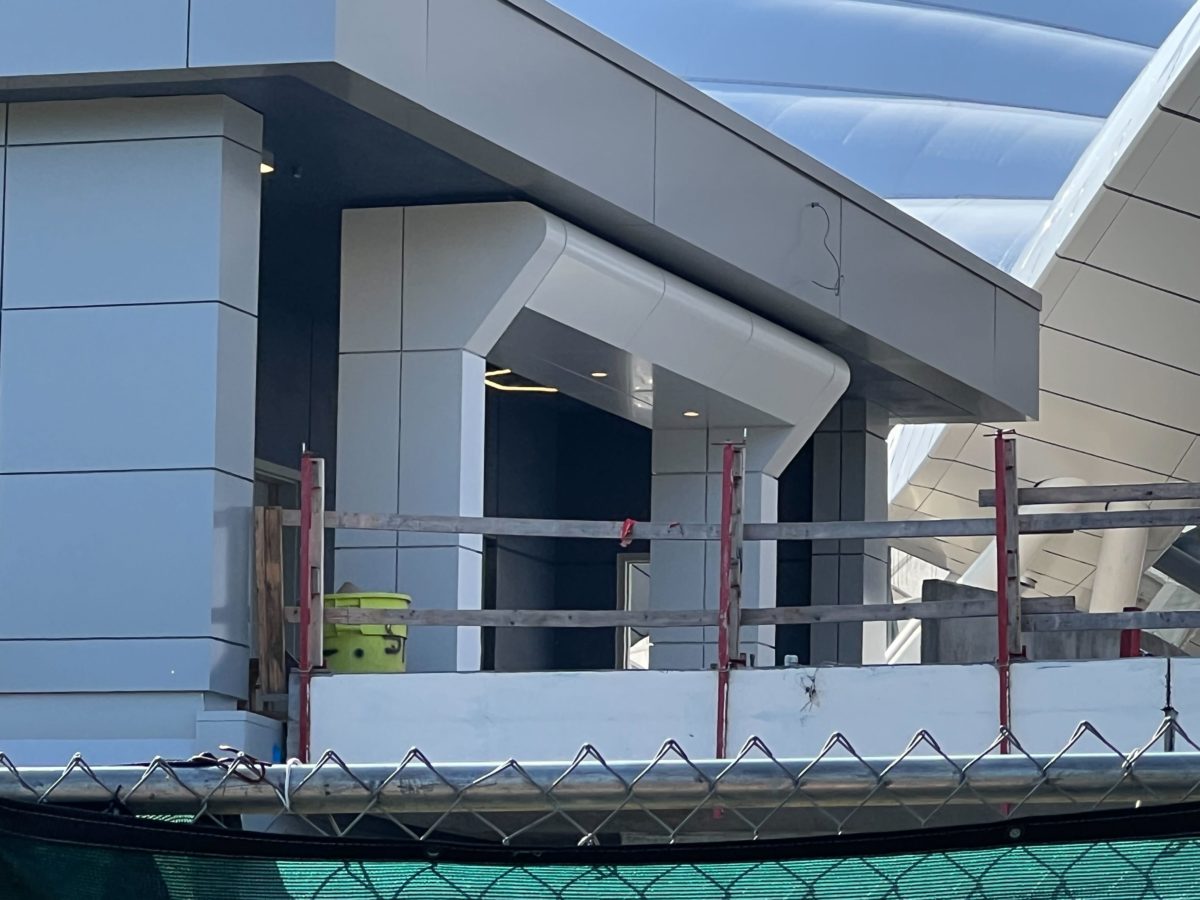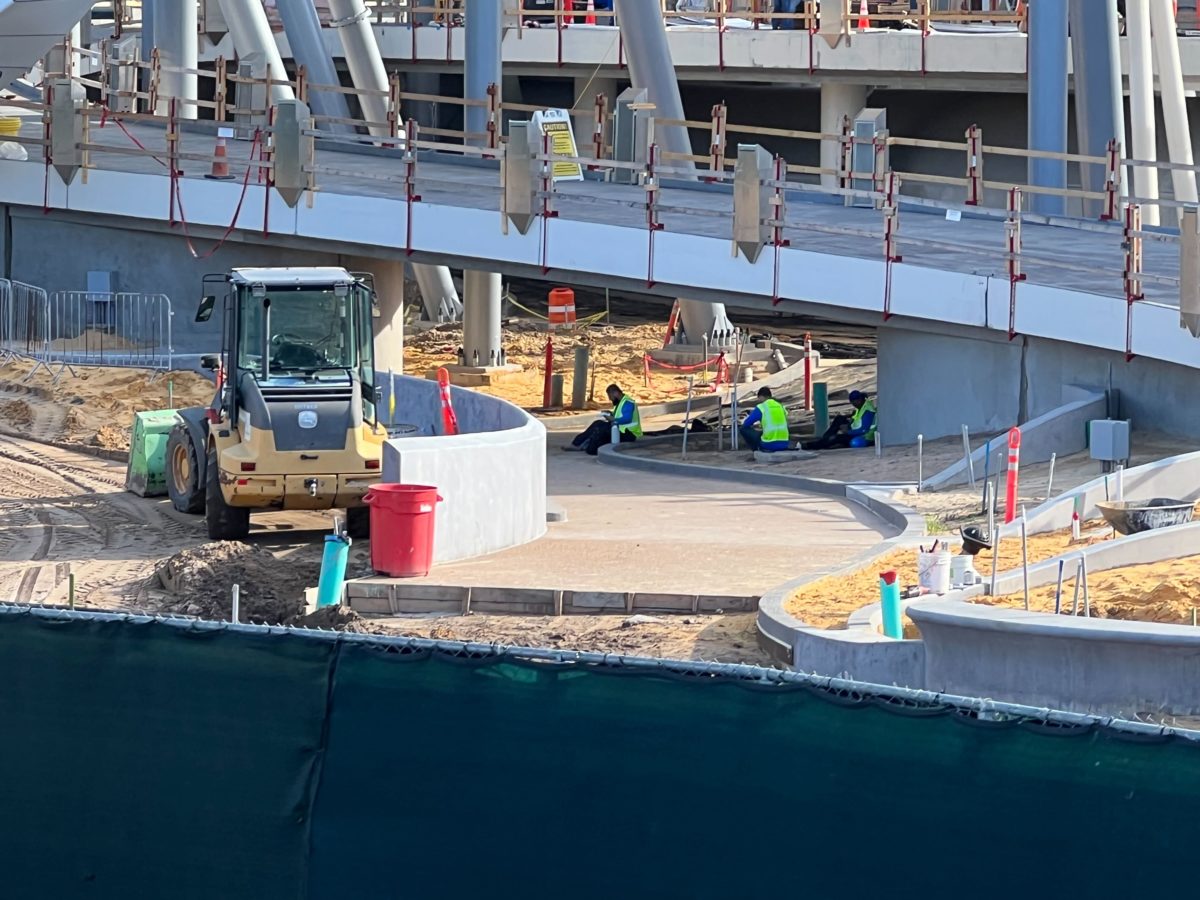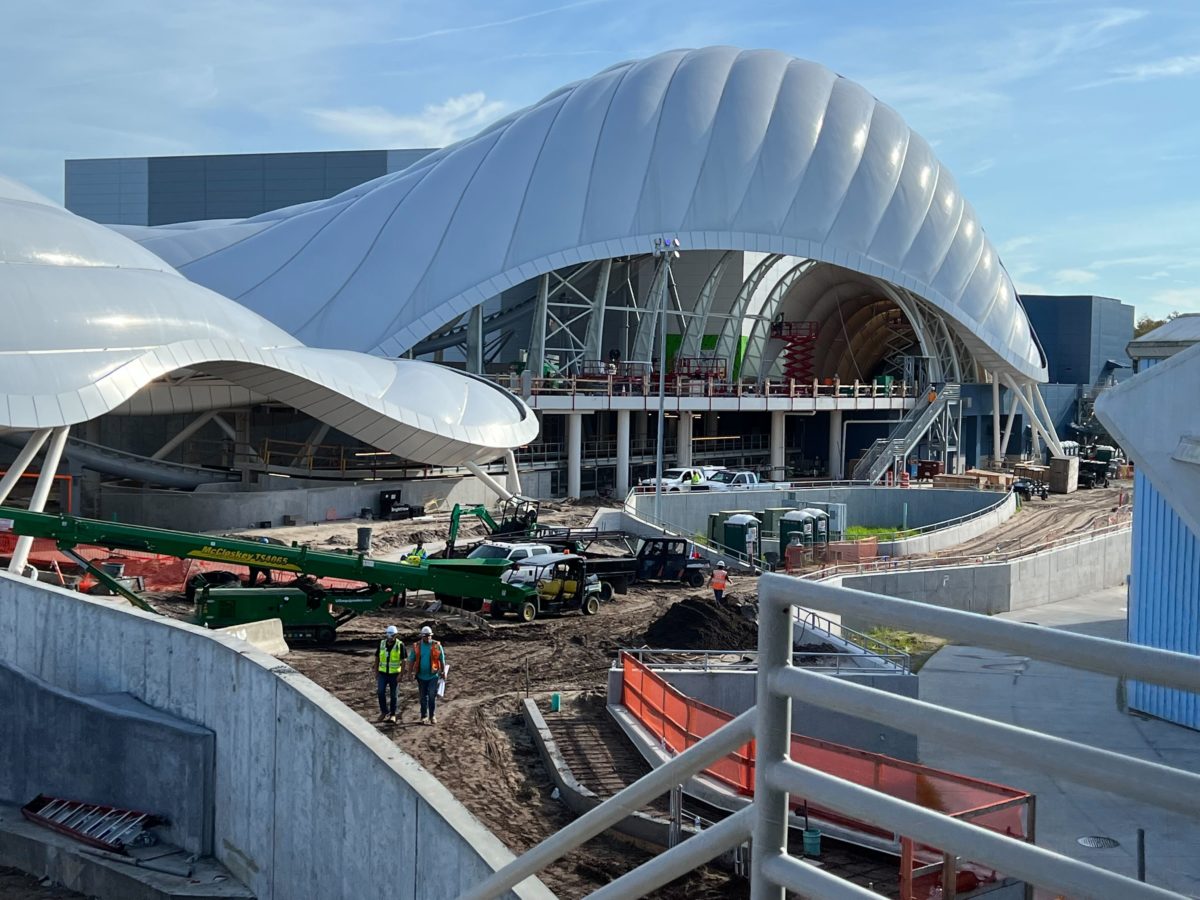 The planters outside of the attraction are filled with dirt and the construction equipment has shifted off to the sides.