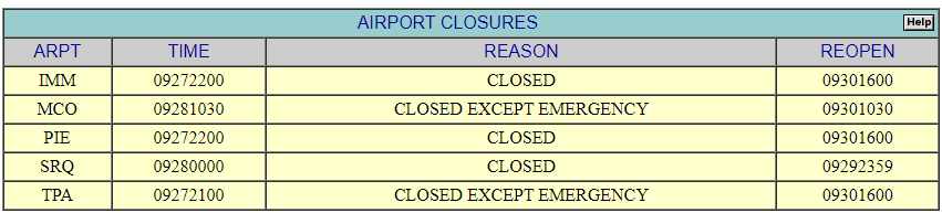 The Federal Aviation Administration (FAA) has issued a “closed except emergency” order for MCO. The airport will close at 10:30 a.m. on Wednesday and will reopen at 10:30 a.m. on Friday, though the schedule is subject to change. They are advising travelers to contact their airlines about canceled or rescheduled travel.