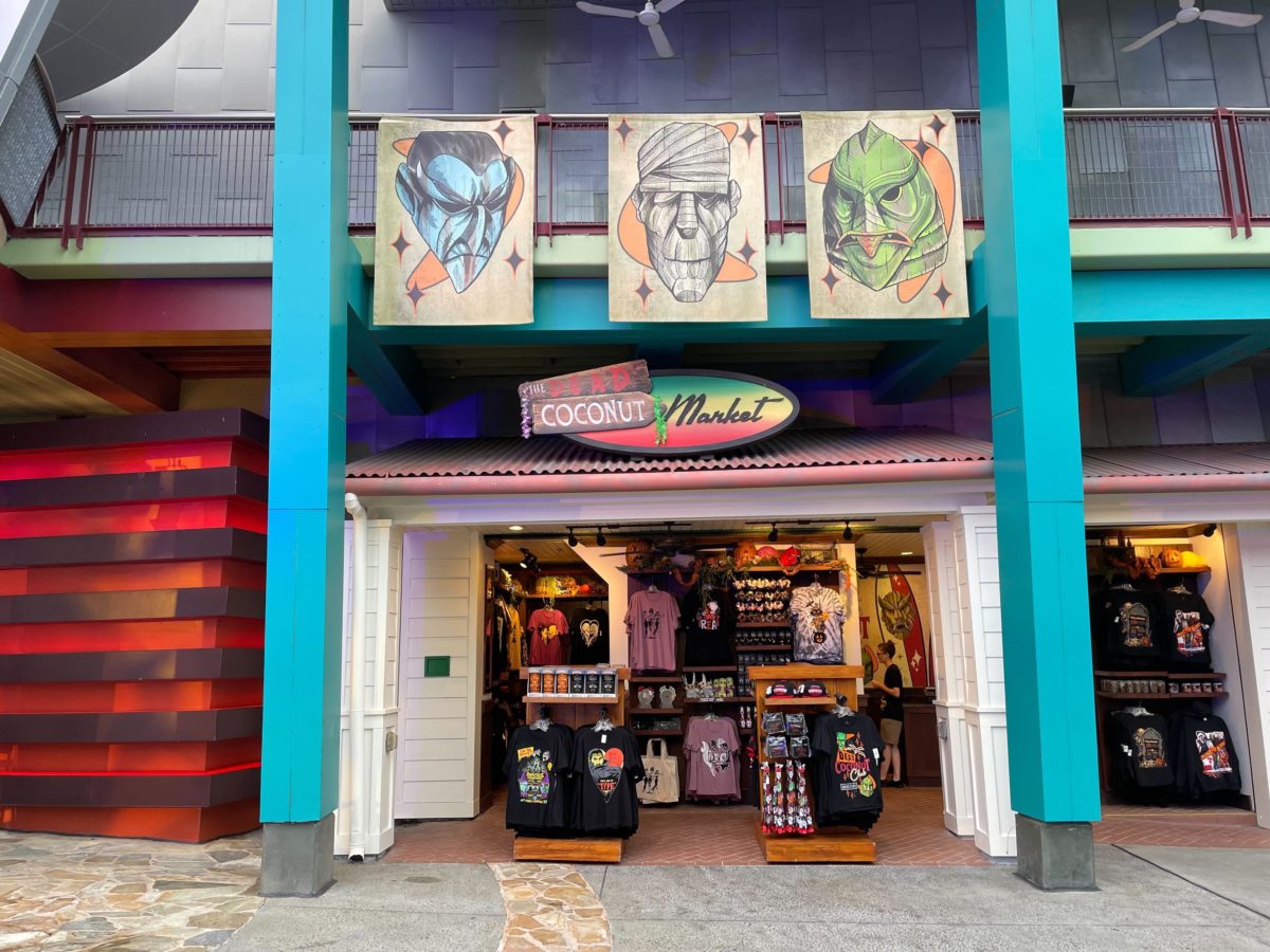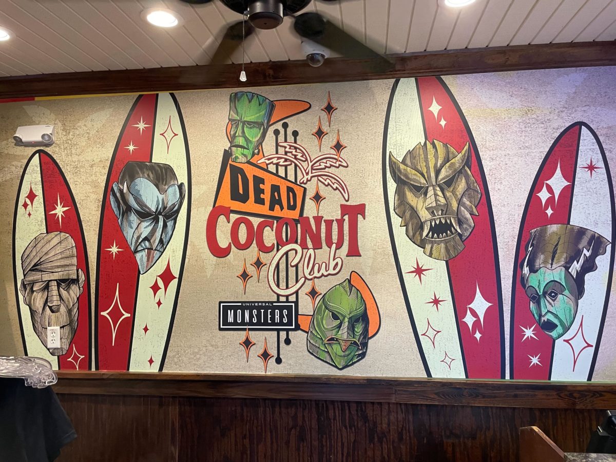 The outside of The Dead Coconut Market also displays artwork of the Universal Monsters as tiki masks.