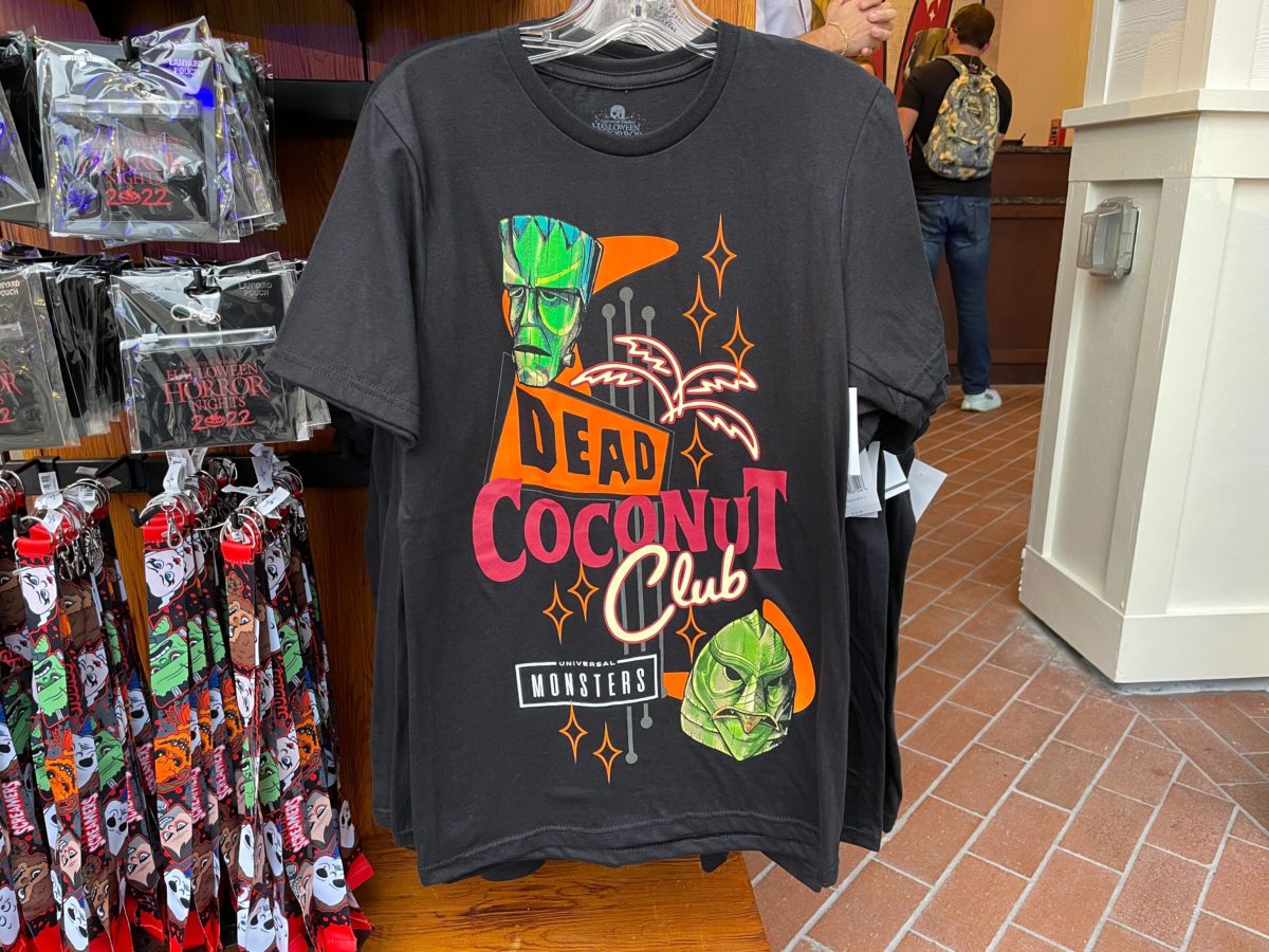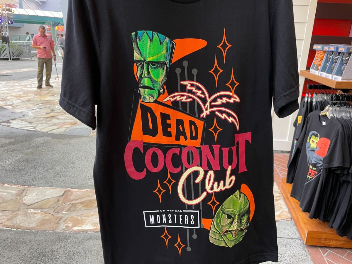 The transformation of the Red Coconut Club into the Dead Coconut Club at CityWalk for Halloween Horror Nights brings with it some new merchandise. We recently discovered a new t-shirt sporting the Dead Coconut Club logo with some fan favorite Universal Monsters on the design.