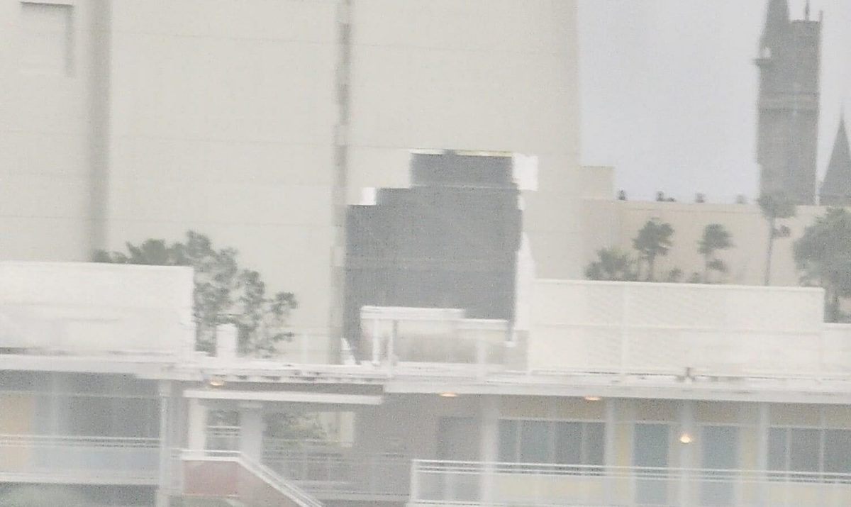 Universal Orlando Resort guest Kristen Tessendorf shared photos of Jurassic Park River Adventure from her hotel room. Paneling has been torn off the side of the building, near the drop.