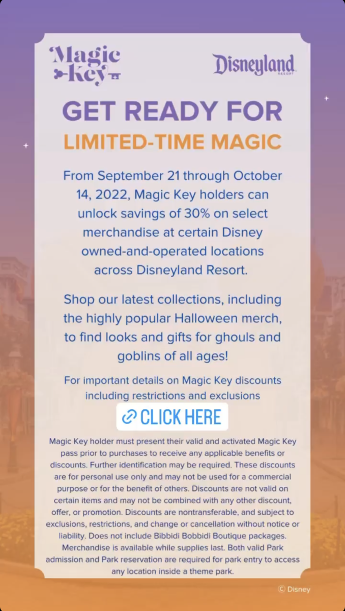 The merchandise discount will be increased to 30% for all tiers starting on September 21, 2022. This increased discount will be available through October 14, 2022. As usual, guests must present their Magic Key pass and ID to receive the discount.