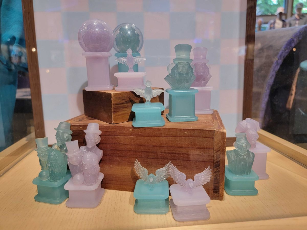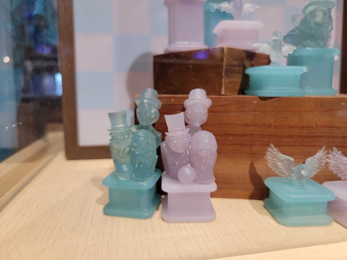 They had a display board set up. The pawns are a mix of the iconic raven and the bat stanchions found in the queue. The board also features the Groundskeeper as the rook, the Headless Knight as the knight, the Hitchhiking Ghosts as the bishop, Madame Leota as the queen, and the Hatbox Ghost as the King.