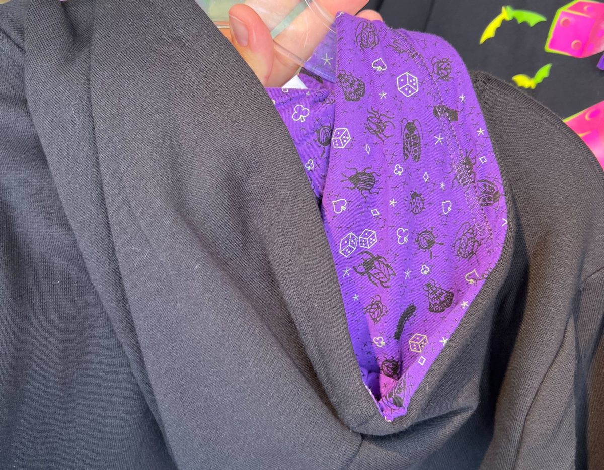 The hoodie’s drawstrings and interior are purple.