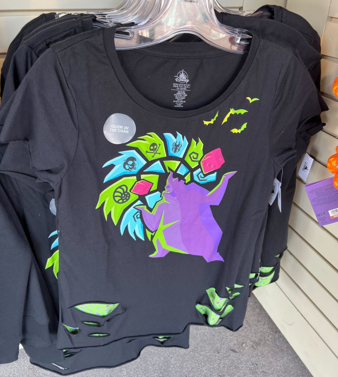 This hoodie is black, with Oogie pictured in purple and green. Bats fly across him and a pair of pink dice tumble across the front. The design glows in the dark.
