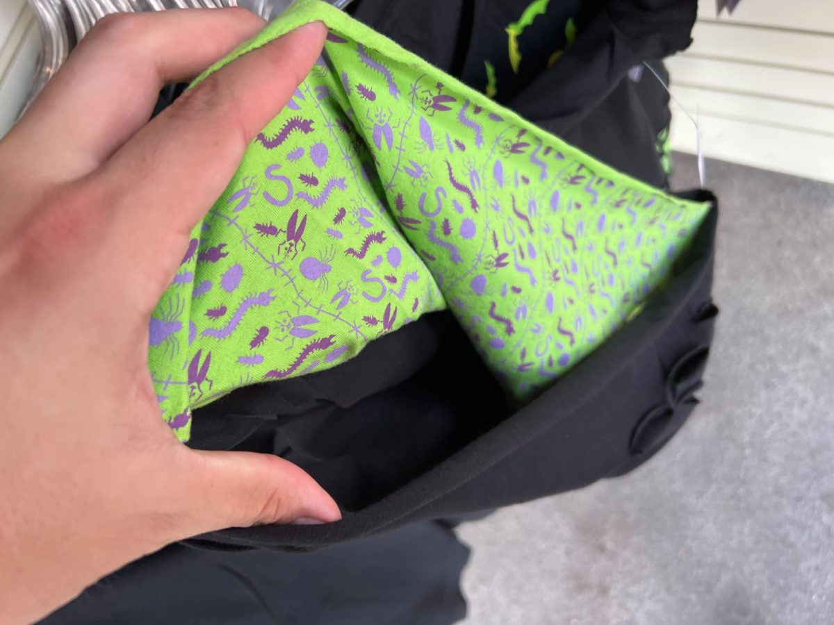 There are some tatters in the top layer of the shirt, showing a green fabric patterned with bugs underneath.
