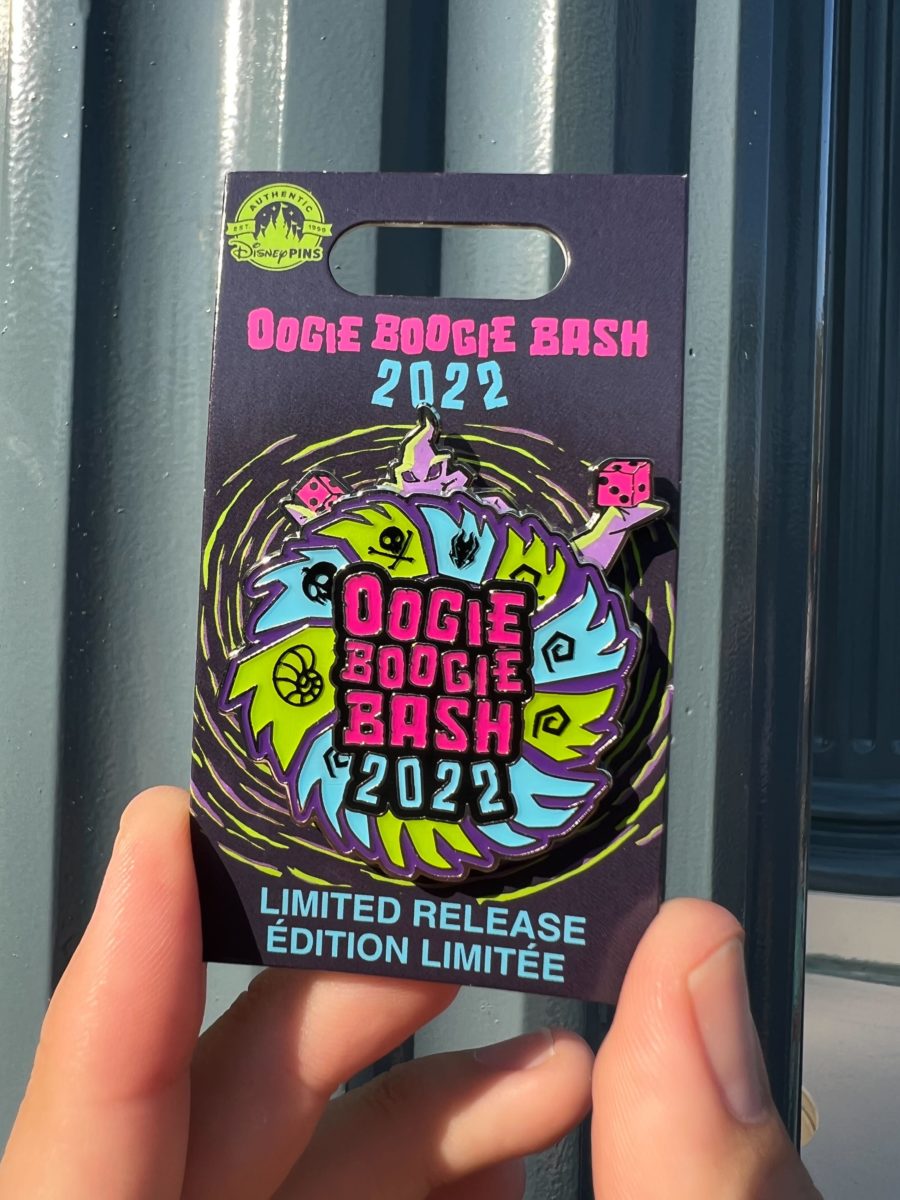 This pin resemble’s Oogie’s wheel, with “Oogie Boogie Bash 2022” at the center.