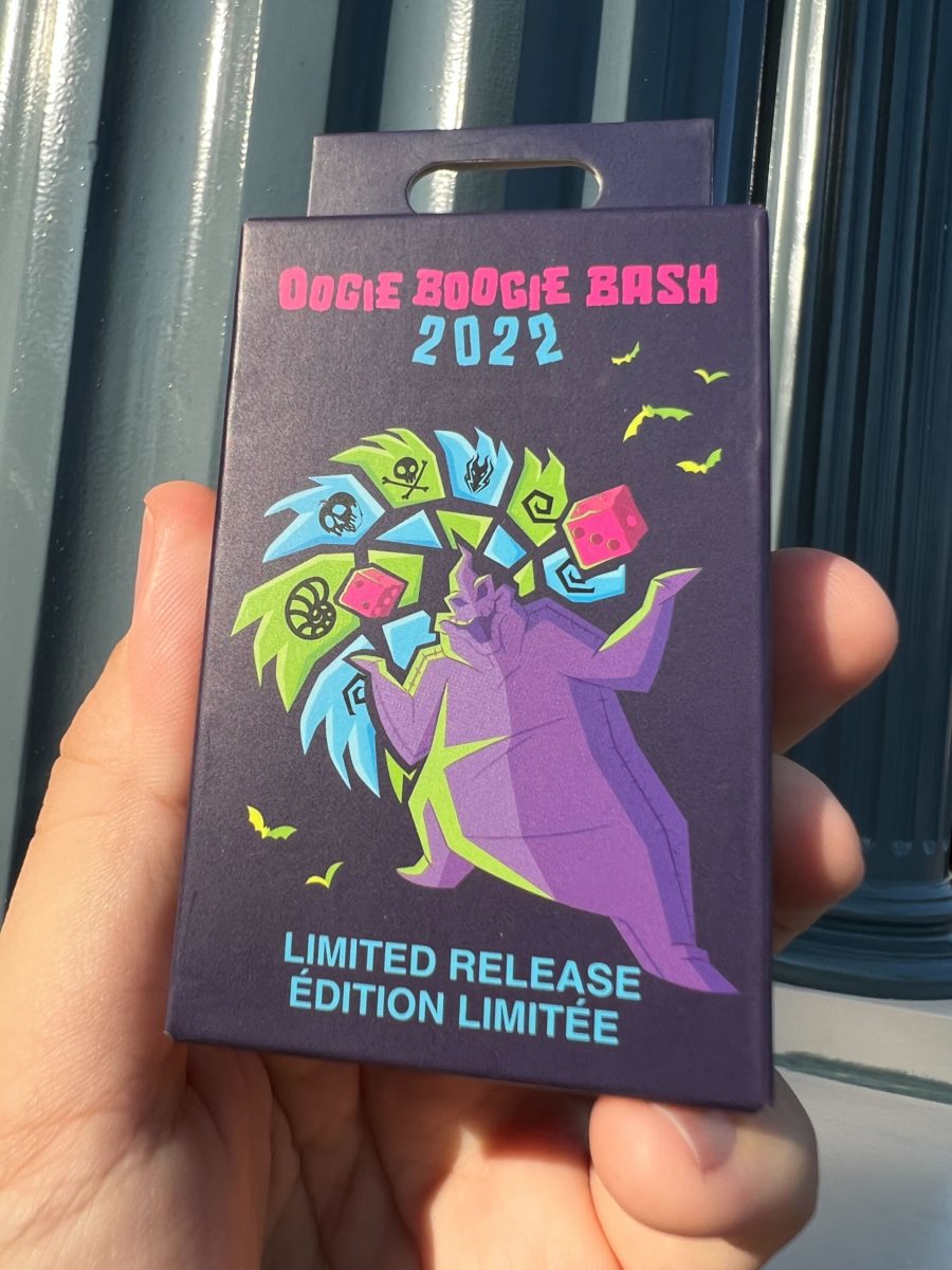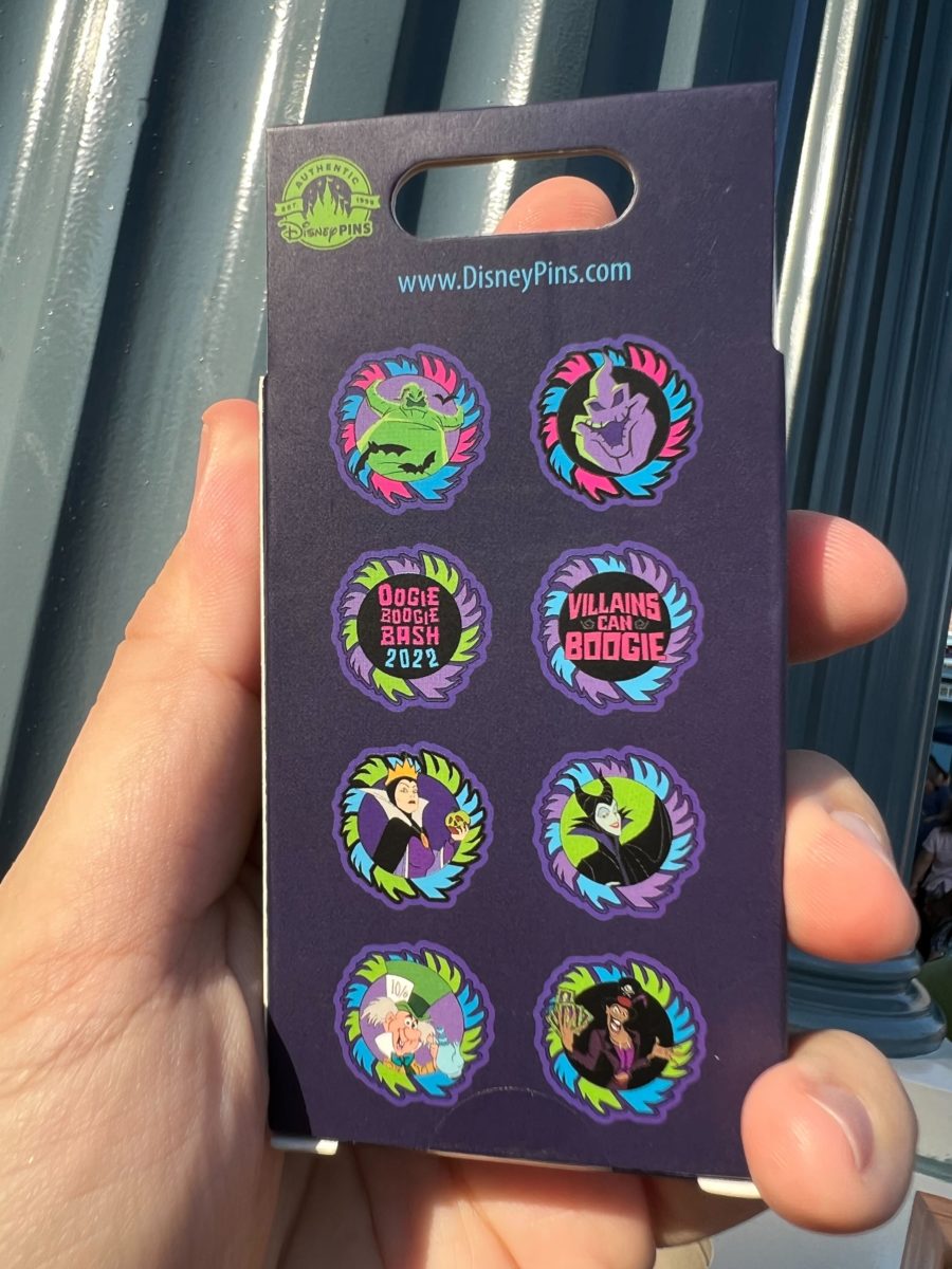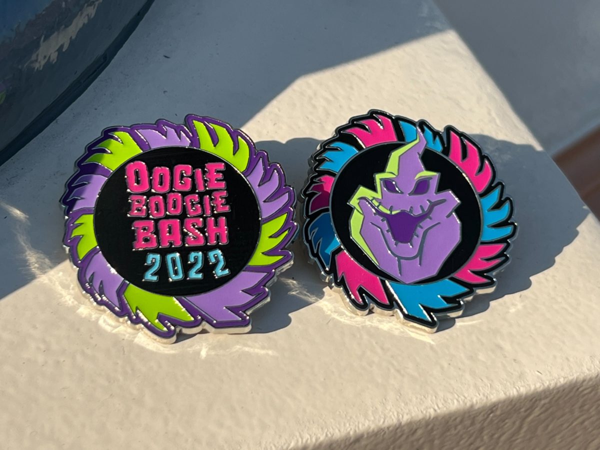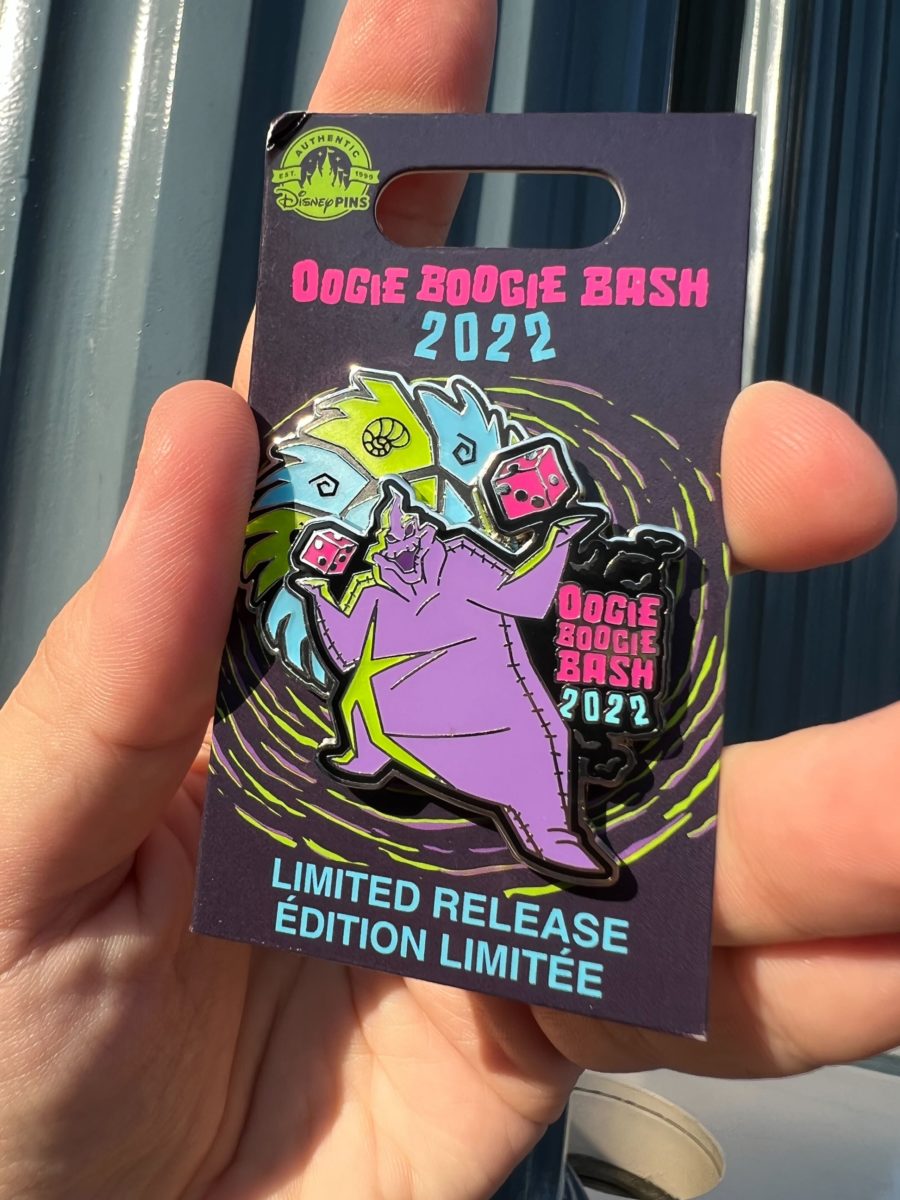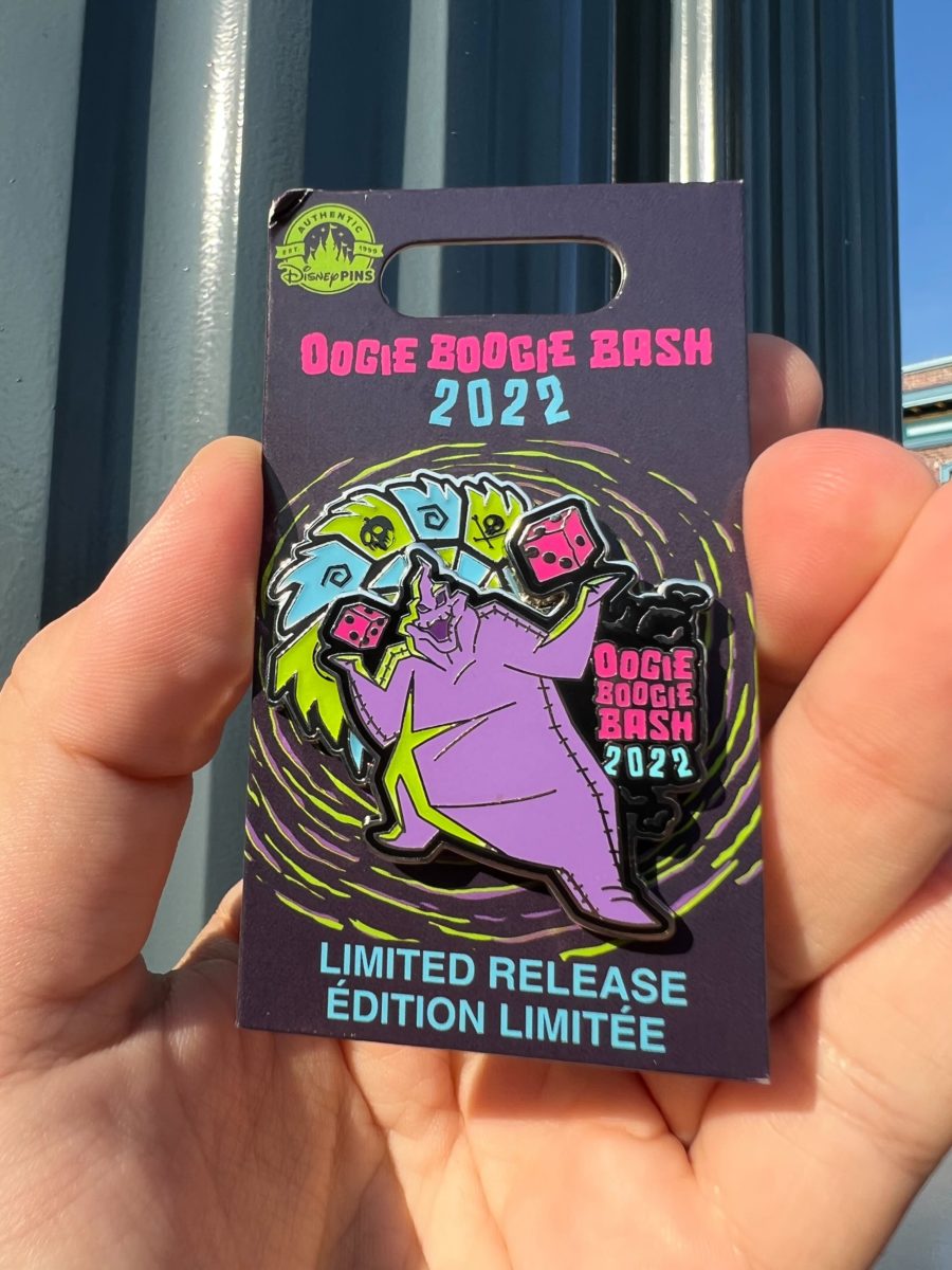 We got the “Oogie Boogie Bash 2022” and purple Oogie Boogie pins. Each one is shaped like Oogie’s wheel, with different colors on the edges.