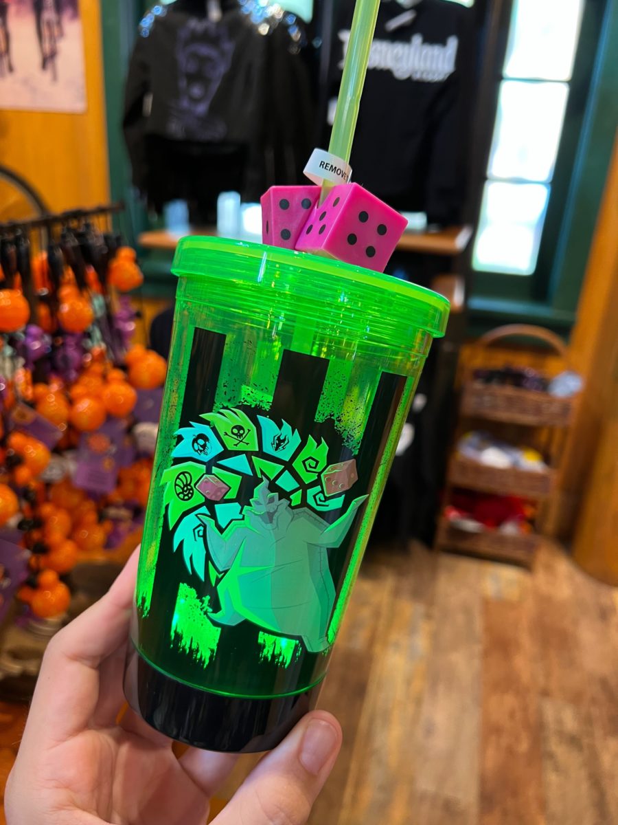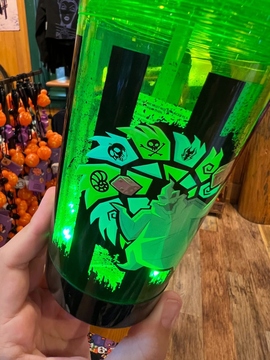 The bottom of the cup glows, illuminating Oogie Boogie in green.