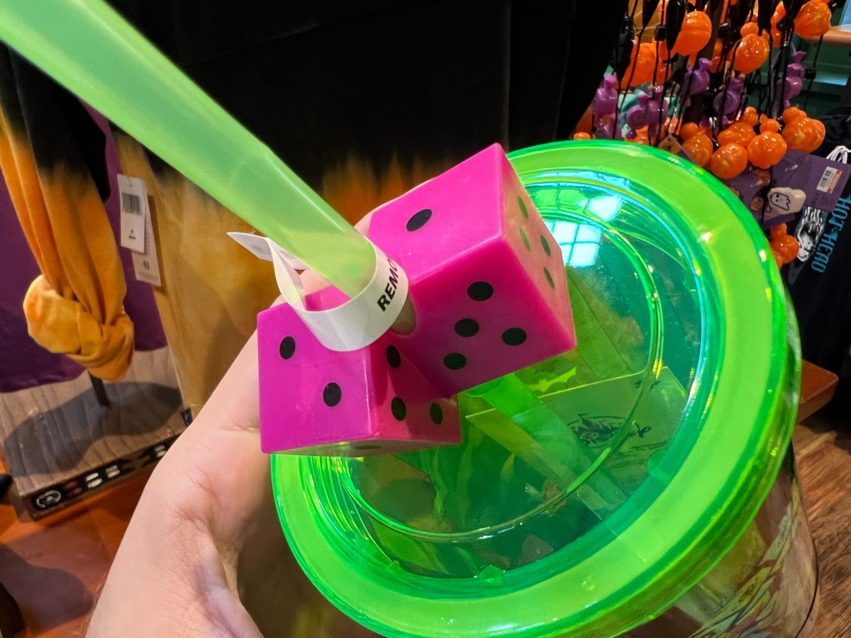 A pair of pink dice is attached to the green straw.