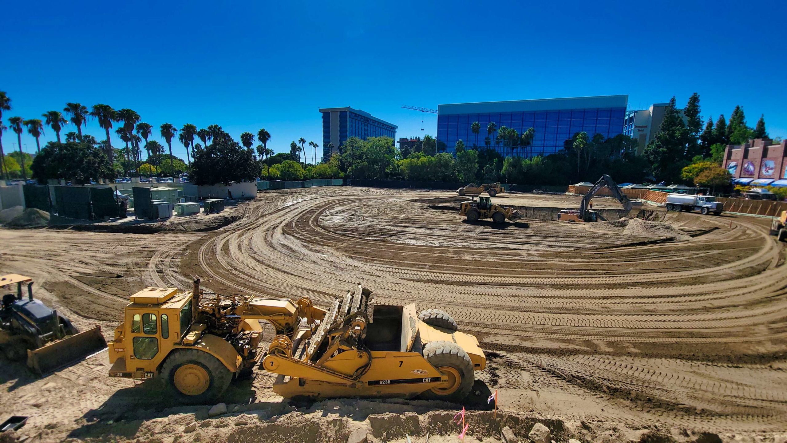 And speaking of the construction, we can see over those themed walls from aboard the Monorail to check in on the progress. Work has finally resumed and grading is underway.