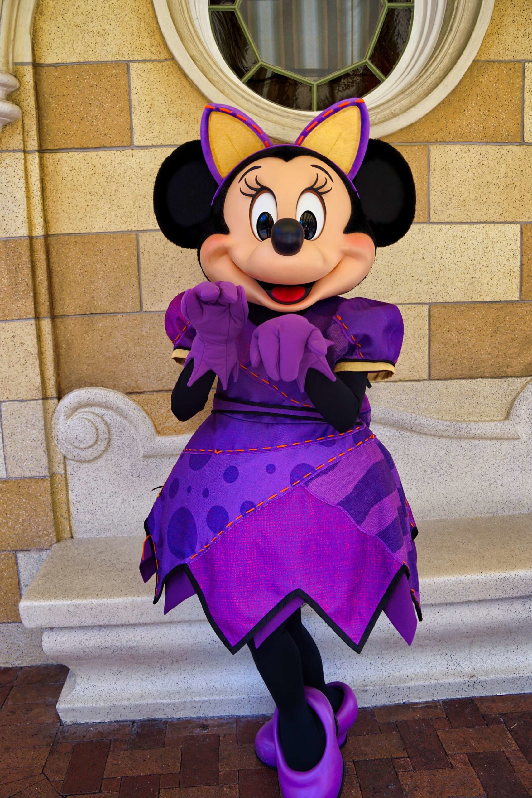 Minnie Mouse was out on Main Street, U.S.A. to greet guests in her Halloween costume. She is dressed as a cat, making for an ironic and cute outfit.