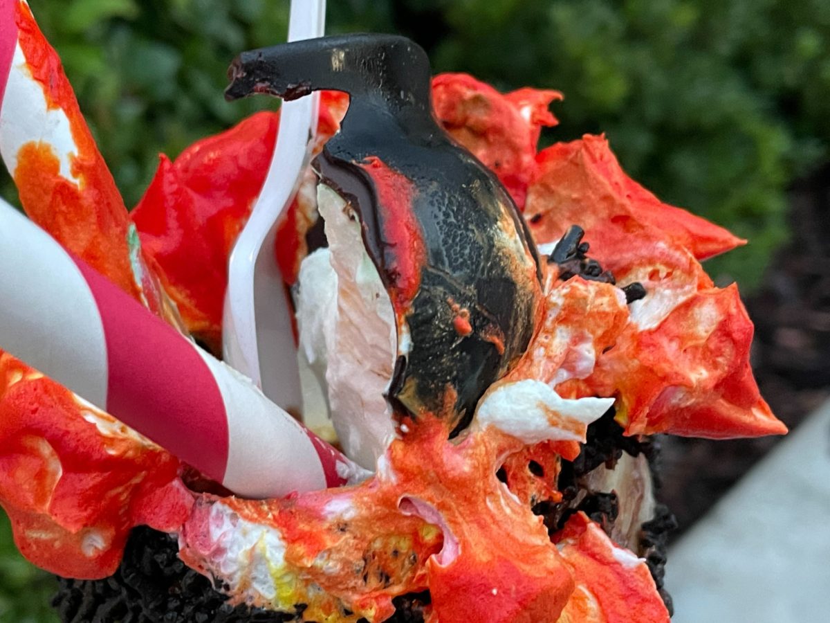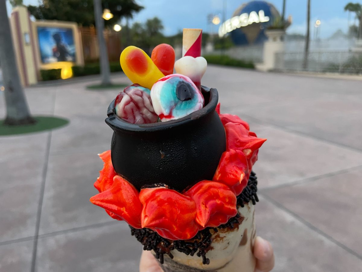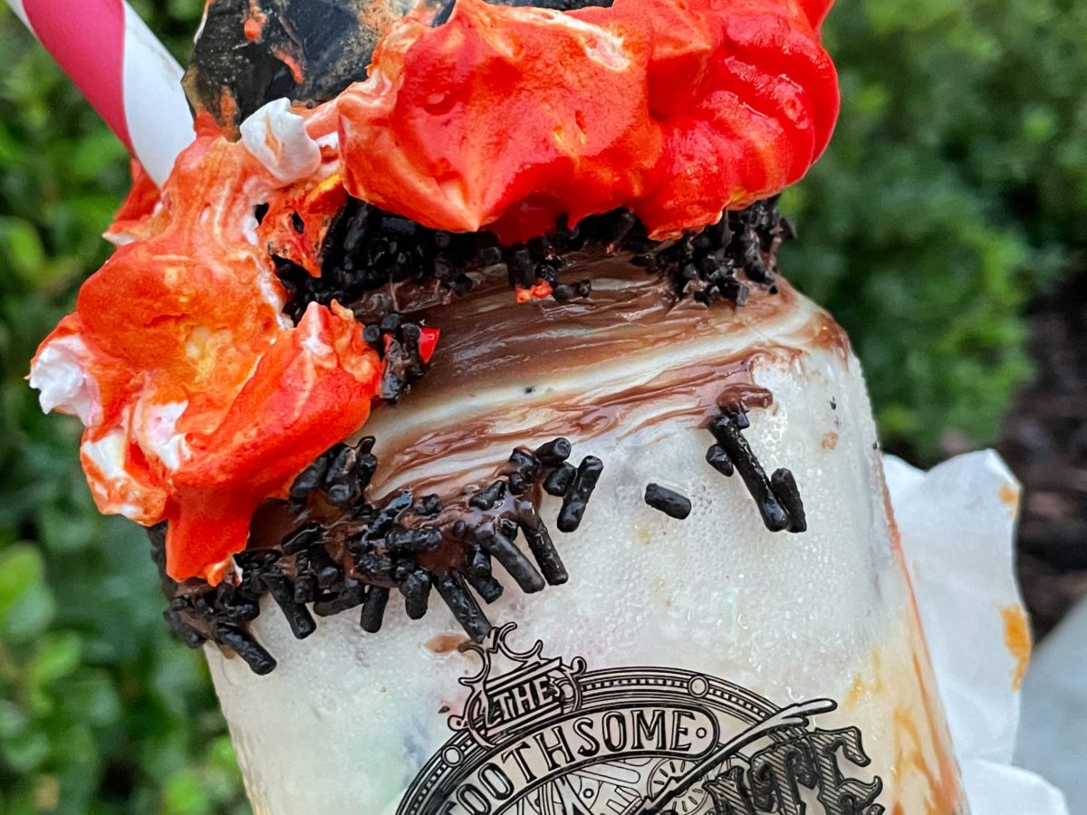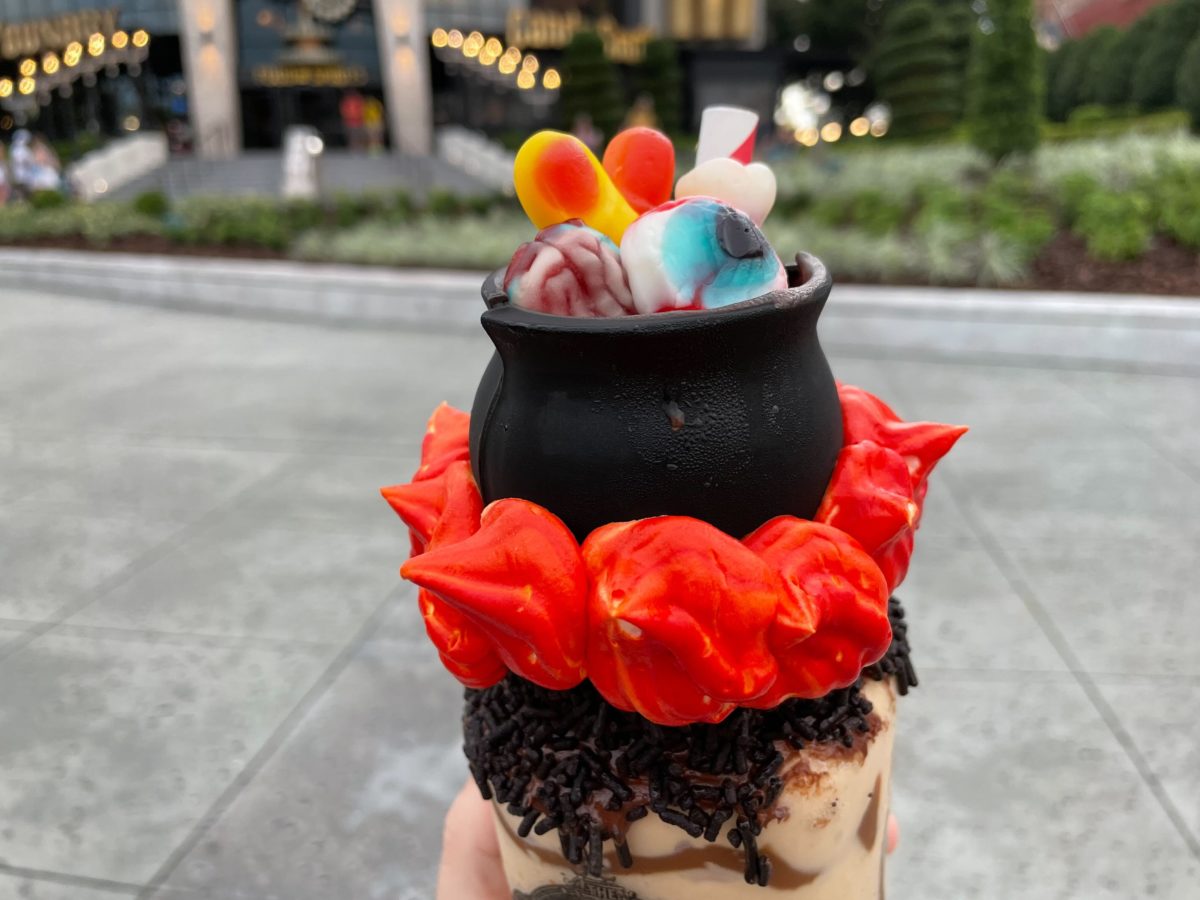 To finish off this shake, you’ll find a dark chocolate cauldron perched atop a whipped cream fire. Inside the cauldron, a witch’s brew of whipped cream and gummy body parts awaits. The gummy body parts were absolutely delicious. A brain, eyeball, bone, and fingers filled the cauldron. These were fresh, chewy and tasted like fruit punch.