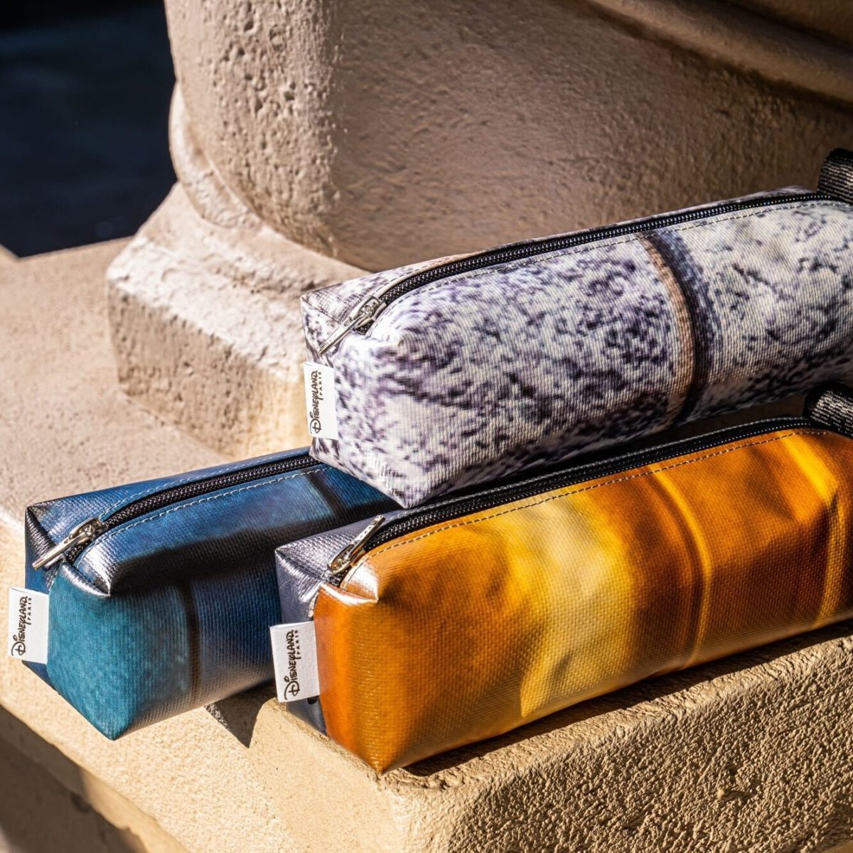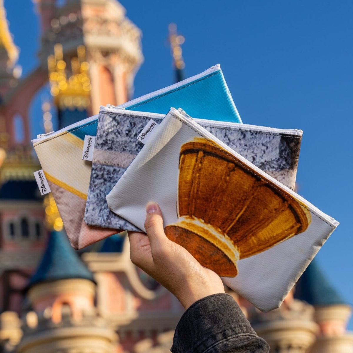 Le Château de la Belle au Bois Dormant (Sleeping Beauty Castle) was covered in scaffolding and themed tarp for a year ahead of the resort’s 30th anniversary. Rather than throw away the tarp, it has been cut up and turned into tote bags, duffel bags, briefcases, and pouches