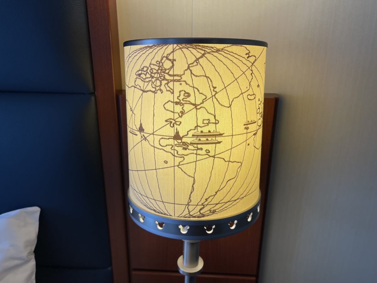The lampshade at the side of the bed resembles a globe. All the Disney Parks (except Shanghai Disneyland) are labeled with castles, and it features all the Disney Cruise Line ships (except the Disney Wish).