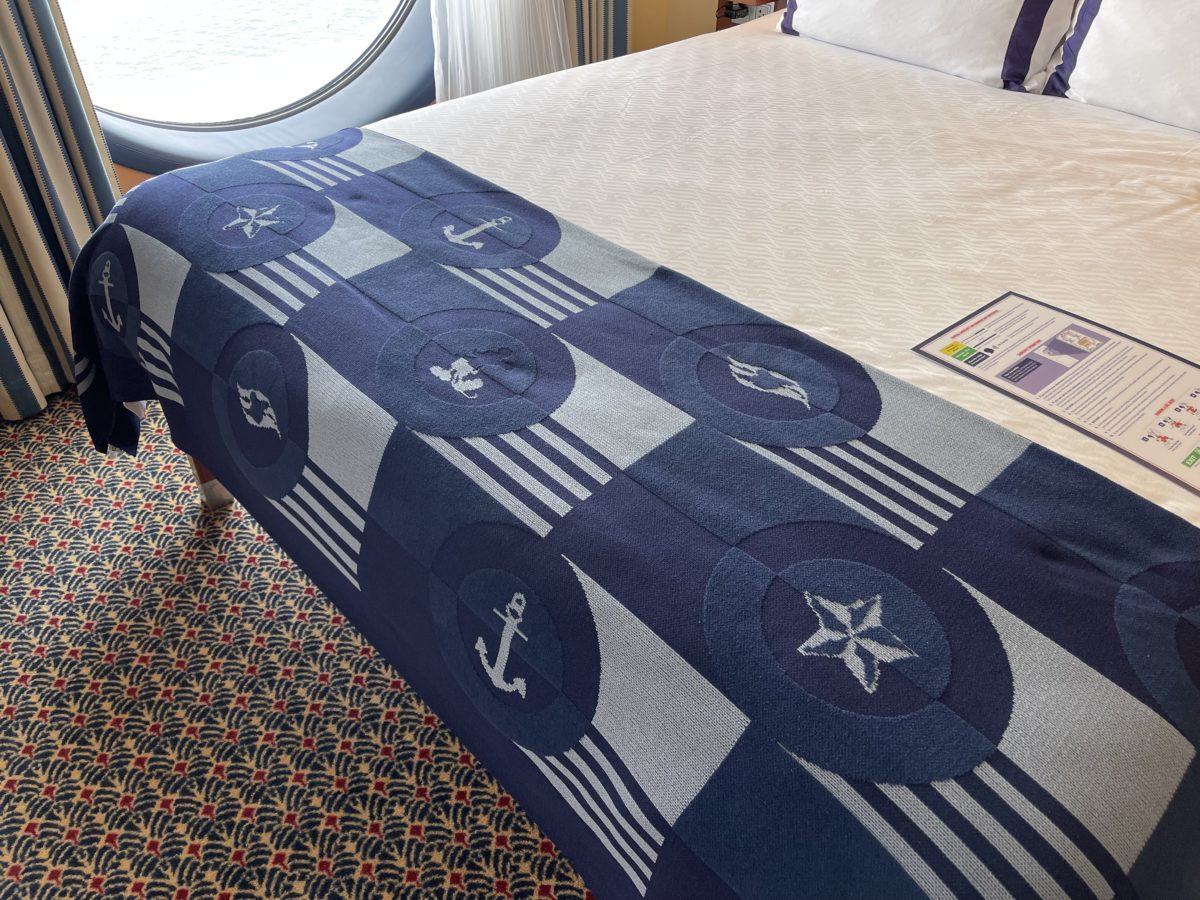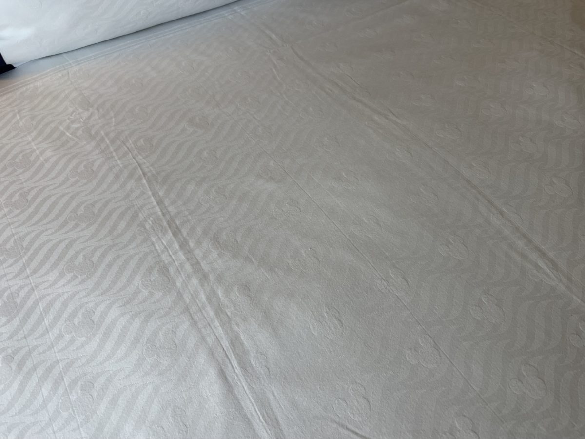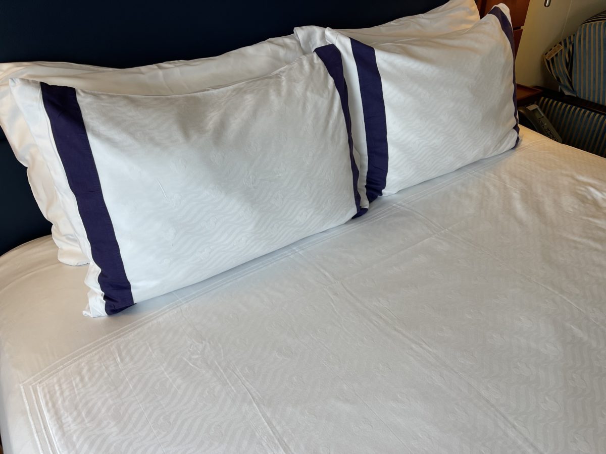 The Disney Cruise Line logo is patterned on the white bedding and pillowcases. The pillowcases also have dark blue stripes at the edges.