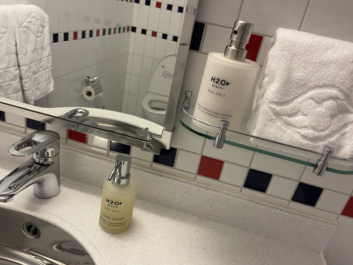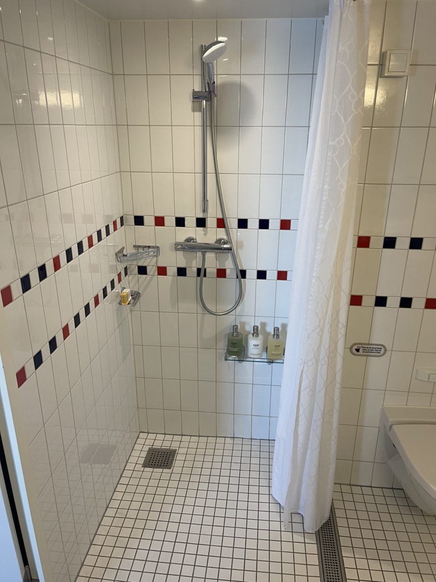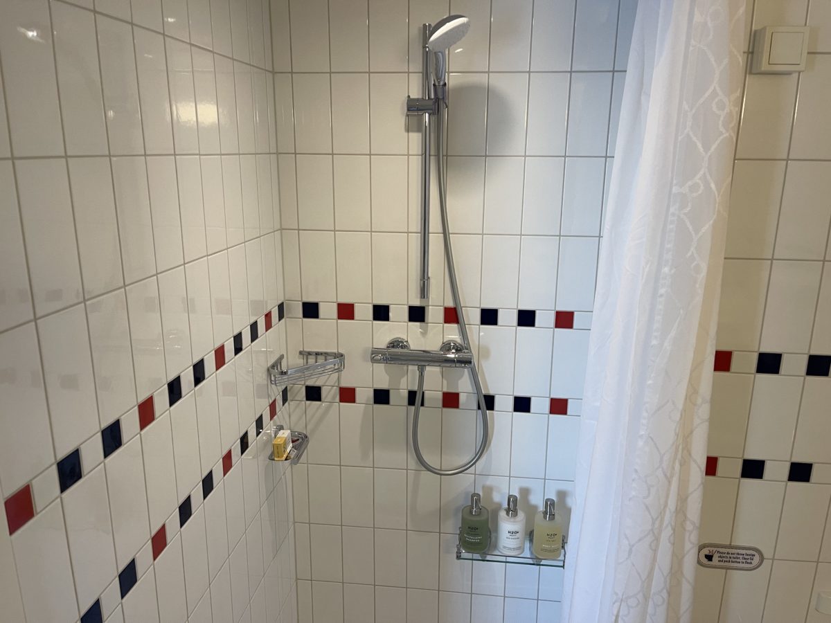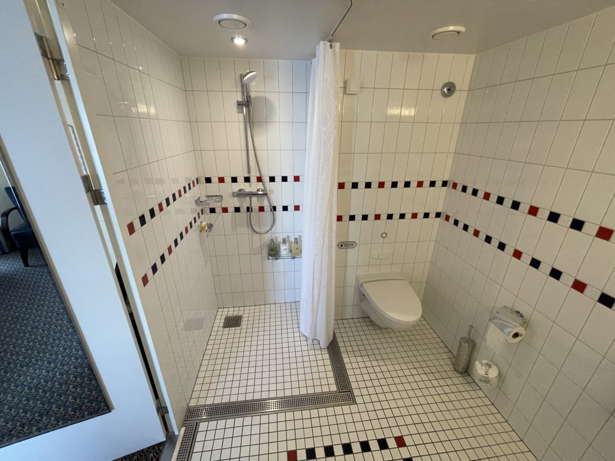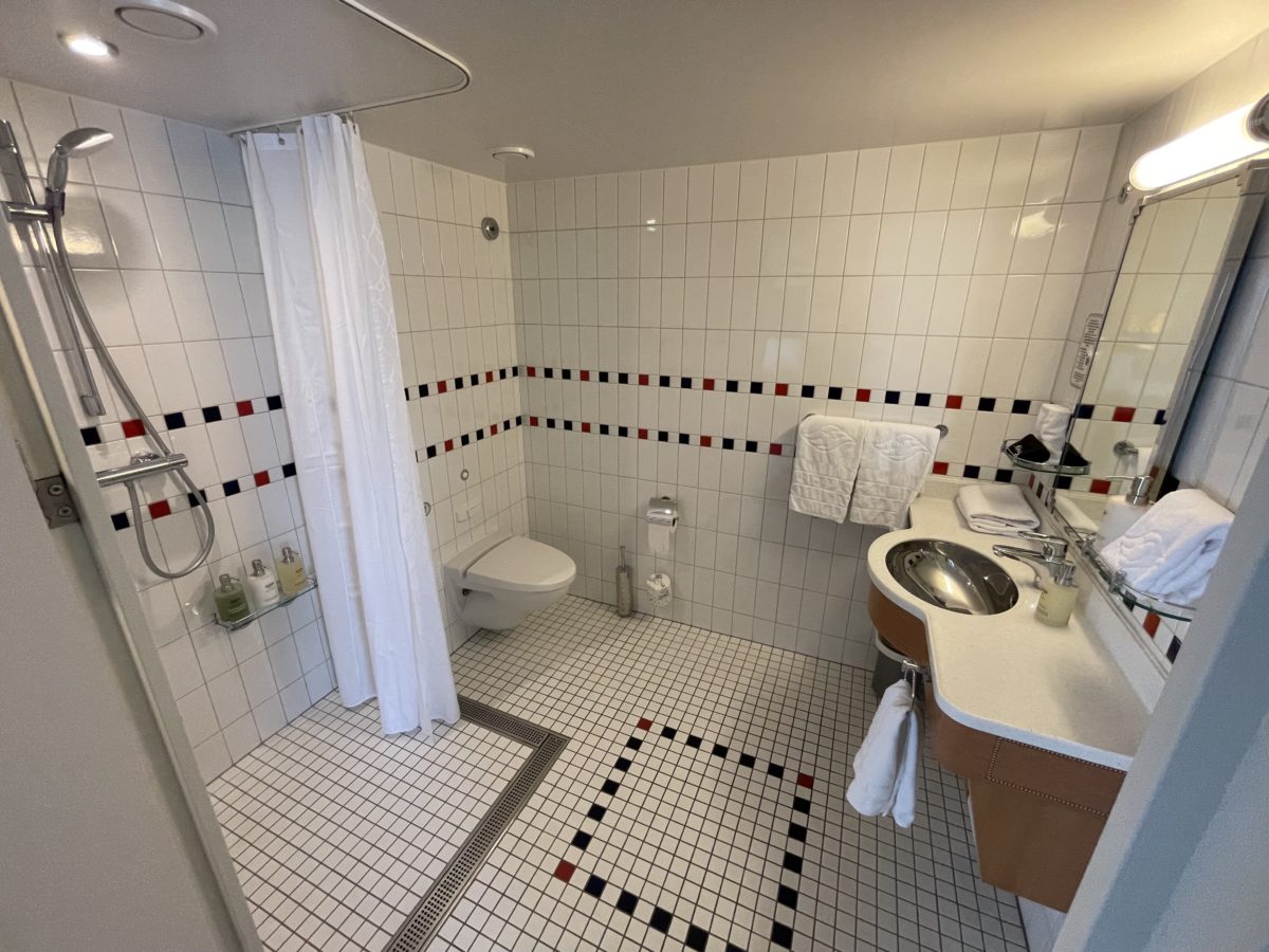 Also unlike standard staterooms, there’s no step up into this bathroom. There’s no step into the shower either, the bathroom has an entirely flat tile floor. Grates outline the shower area, and another grate is at the threshold of the door.