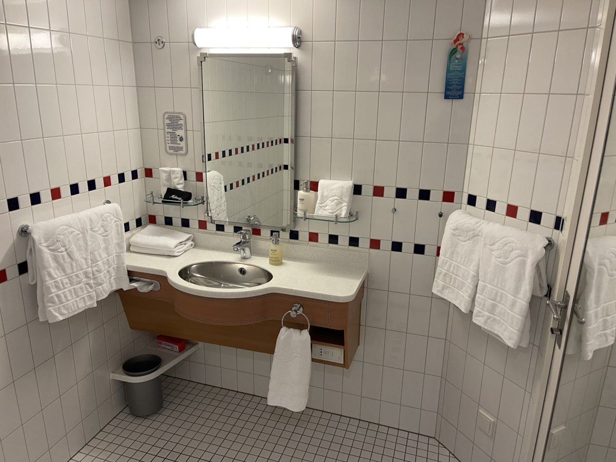 There’s a single sink vanity, with a trash can mounted below. The towels are all branded with the Disney Cruise Line logo.